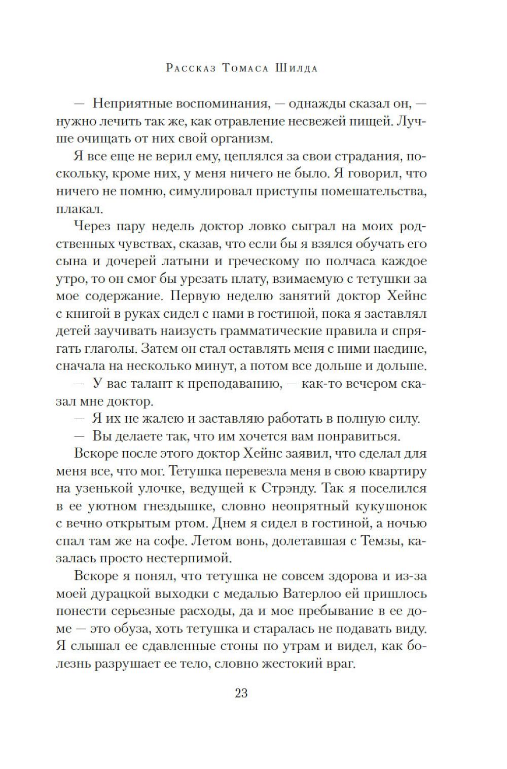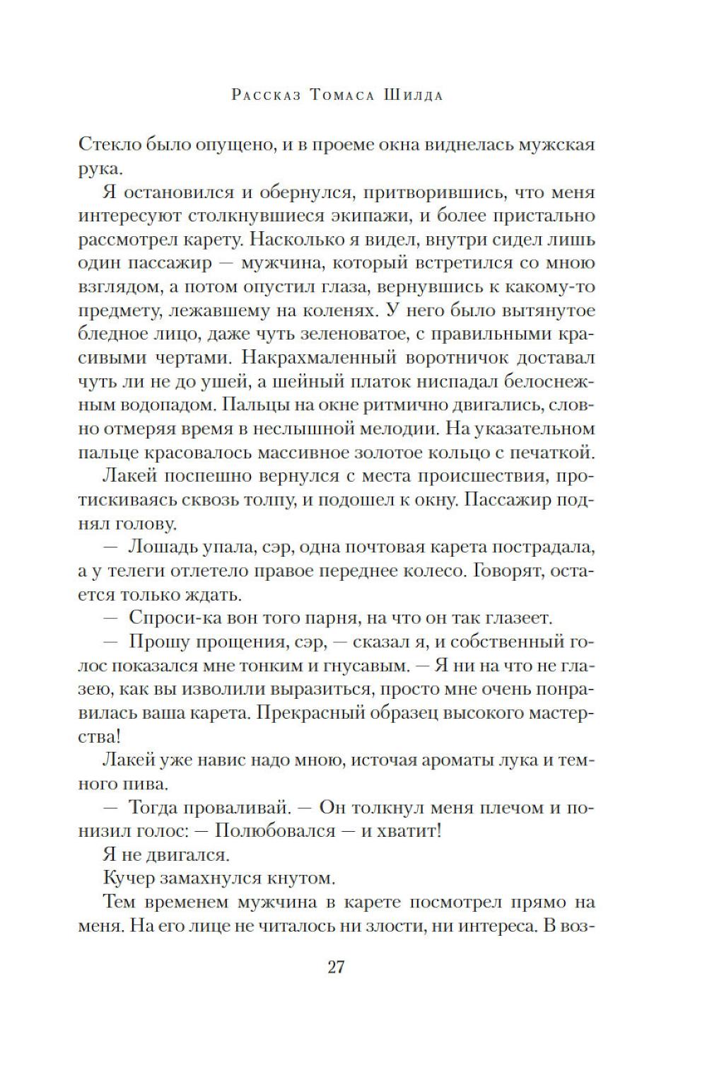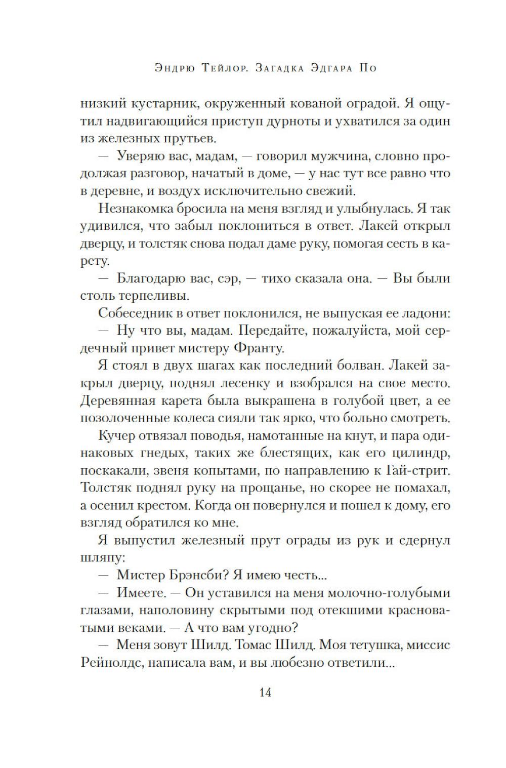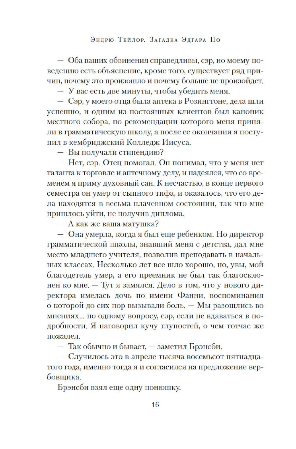 Англия времен Регентства, 1819 год. Вопреки отсутствию рекомендаций Томас Шилд получает место помощника учителя в пригороде Лондона. Среди его учеников - юный американец Эдгар По, приемный сын Алланов, и его лучший друг, избалованный неженка Чарльз Франт. Мальчики удивительно похожи друг на друга... Томас влюбляется в красивую, но не слишком счастливую мать Чарльза и постепенно увязает в паутине чужих семейных тайн и интриг. Когда на задворках столицы находят обезображенный труп, все улики указывают на семью Франт. Поневоле втянутый в эту запутанную историю, Шилд понимает, что у него более чем достаточно причин для беспокойства. А вскоре выясняется, что в центре этих жутких событий фигурирует маленький американец... Книга входит в топ-10 лучших детективных романов десятилетия по версии Sunday Times.