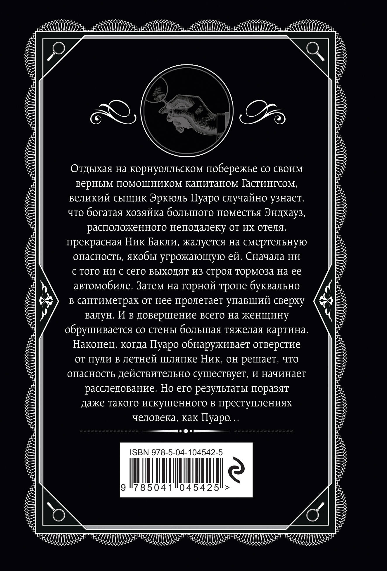Отдыхая на корнуолльском побережье со своим верным помощником капитаном Гастингсом, великий сыщик Эркюль Пуаро случайно узнает, что богатая хозяйка большого поместья Эндхауз, расположенного неподалеку от их отеля, прекрасная Ник Бакли жалуется на смертельную опасность, якобы угрожающую ей. Сначала, ни с того ни с сего, выходят из строя тормоза на ее автомобиле. Затем, на горной тропе, буквально в сантиметрах от нее пролетает упавший сверху валун. И, в довершение всего, на женщину обрушивается со стены большая тяжелая картина. Наконец, когда Пуаро обнаруживает отверстие от пули в летней шляпке Ник, он решает, что опасность действительно существует, и начинает расследование. Но его результаты поразят даже такого искушенного в преступлениях человека, как Пуаро…| Издательство | ООО "Издательство "Эксмо" |