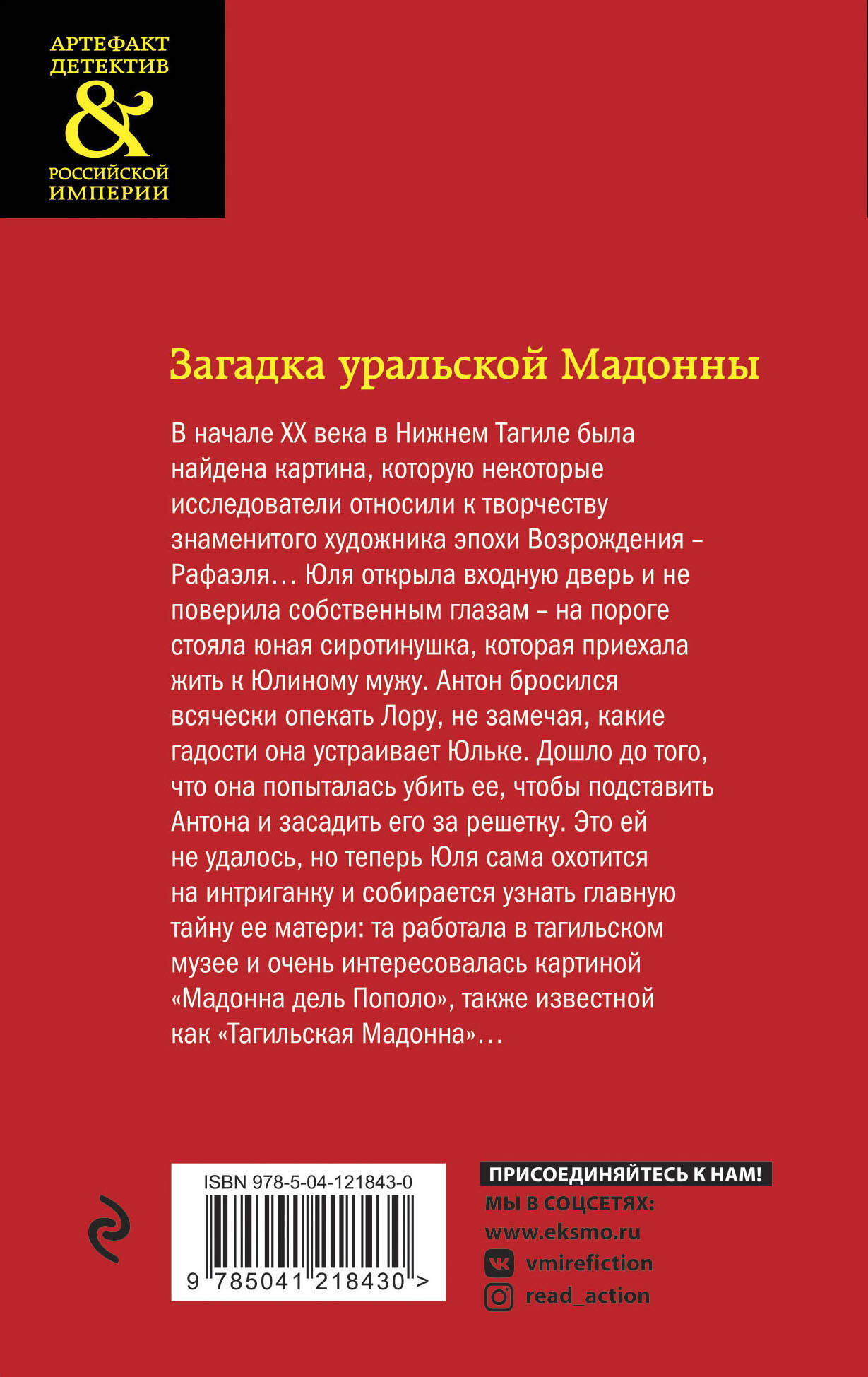 В начале XX века в Нижнем Тагиле была найдена картина, которую некоторые исследователи относили к творчеству знаменитого художника эпохи Возрождения - Рафаэля… Юля открыла входную дверь и не поверила собственным глазам - на пороге стояла юная сиротинушка, которая приехала жить к Юлиному мужу. Антон бросился всячески опекать Лору, не замечая, какие гадости она устраивает Юльке. Дошло до того, что она попыталась убить ее, чтобы подставить Антона и засадить его за решетку. Это ей не удалось, но теперь Юля сама охотится на интриганку и собирается узнать главную тайну ее матери: та работала в тагильском музее и очень интересовалась картиной «Мадонна дель Пополо», также известной как «Тагильская Мадонна»… «Артефакт & Детектив» - это серия для читателей с тонким вкусом. Загадки истории, роковые предметы искусства, блестящая современная интрига на фоне изысканных декораций старины. Сюжет основан на поисках древнего артефакта. Артефакт - вне времени, и кто знает, утихнут ли страсти по нему в новом столетии?| Издательство | ООО "Издательство "Эксмо" |