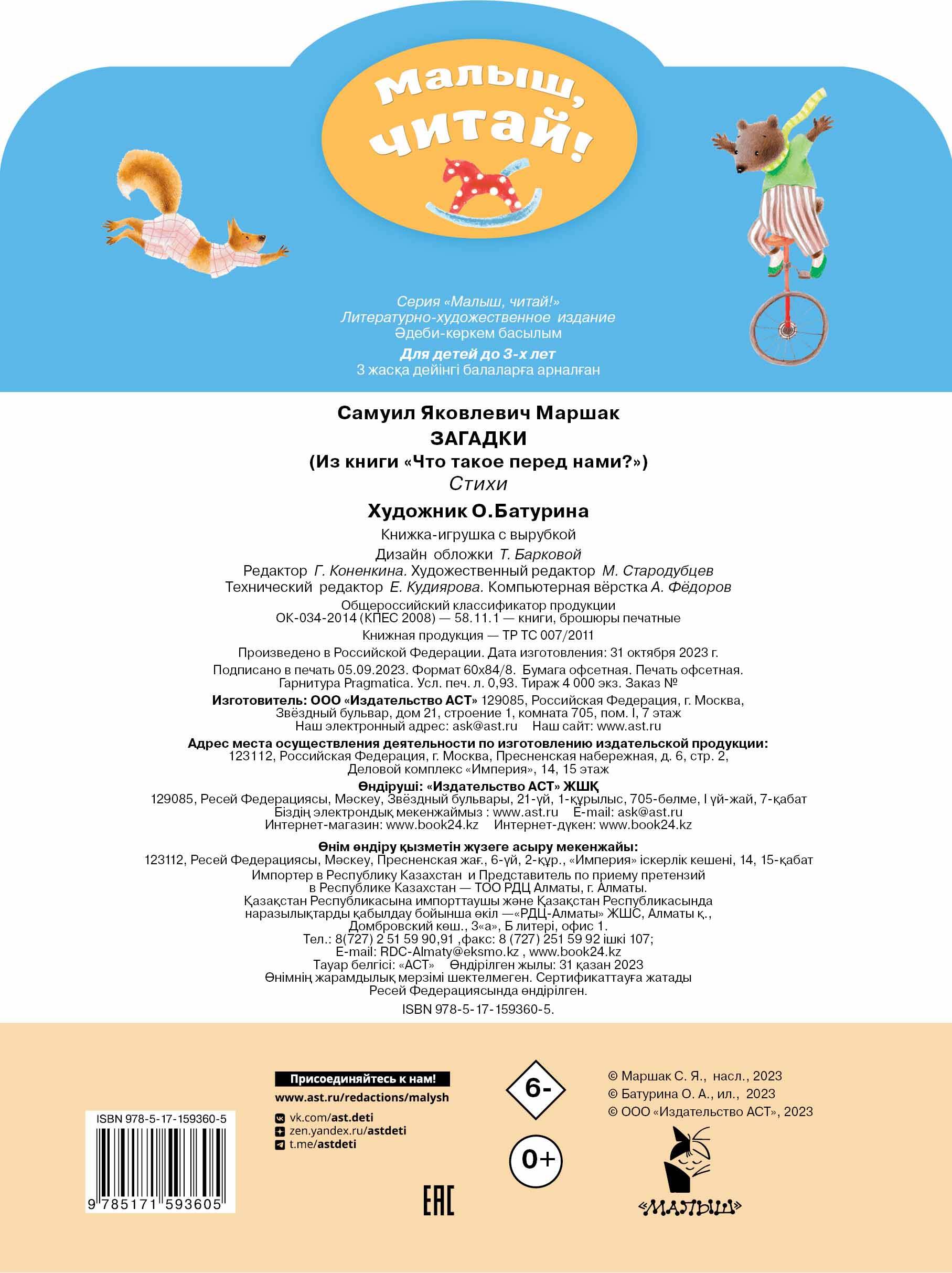 Что это за синий домик с маленькой дверцей-щёлкой? Кого бьют рукой и палкой, а он не обижается? Кто ходит и днём и ночью, но никак не может уйти? Ответы на эти загадки вы наёдёте в книге замечательного детског поэта-классика С. Маршака. А рисунки для загадок нарисовала современная художница О. Батурина.| Издательство | Издательство "АСТ" |
