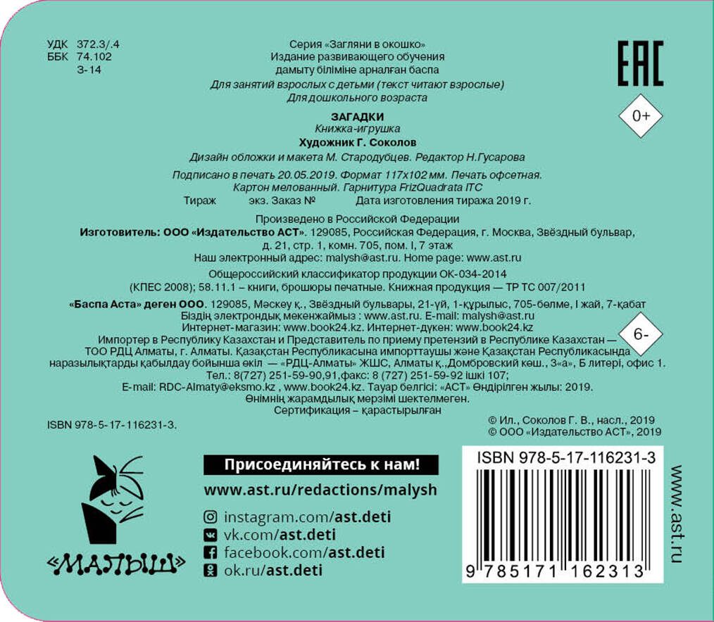 Ваш малыш не интересуется книжками? Дайте ему в ручки книжку-игрушку «Загадки» серии «Загляни в окошко». Эта серия предназначена для юных исследователей, которым интересно всё открывать и радоваться неожиданным сюрпризам. Заглядывайте в окошки вместе с вашими крошками и отгадывайте загадки.| Издательство | ИЗДАТЕЛЬСТВО "АСТ" |