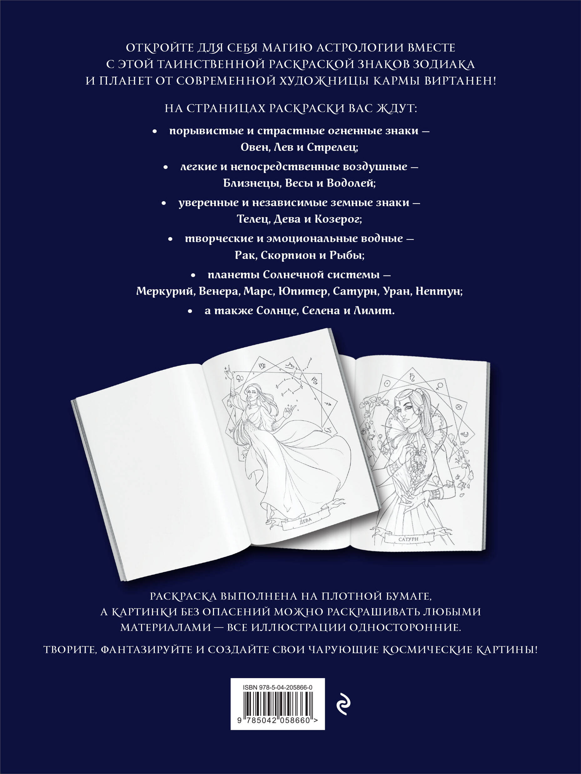 Во все времена люди стремились разгадать тайны звезд. Если вы увлечены темой гороскопов и познания планет, окунитесь в магический мир астрологии вместе с таинственной раскраской-антистресс в новом оформлении! На ее страницах вас ждут знаки Зодиака и планеты: порывистые и страстные огненные знаки - Овен, Лев и Стрелец, легкие и непосредственные воздушные - Близнецы, Весы и Водолей, уверенные и независимые земные знаки - Телец, Дева и Козерог, творческие и эмоциональные водные - Рак, Скорпион и Рыбы, планеты Солнечной системы - Меркурий, Венера, Марс, Юпитер, Сатурн, Уран, Нептун, а также Солнце, Селена и Лилит. Плотная белая бумага позволит раскрашивать иллюстрации любыми материалами: цветными карандашами, фломастерами, капиллярными и гелевыми ручками и спиртовыми маркерами. Откройте для себя магию астрологии вместе с этой таинственной раскраской знаков Зодиака и планет от современной художницы Кармы Виртанен! Творите, фантазируйте и создайте свои чарующие космические картины!| Издательство | ООО "Издательство "Эксмо" |
