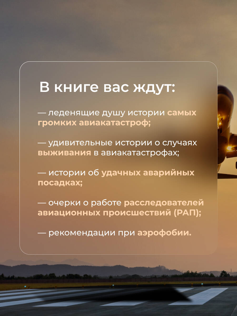 По статистике, самолет - самый безопасный вид транспорта. Но каждая катастрофа заставляет миллионы людей в этом усомниться. За каждой трагедией есть история, которую хранит черный ящик. Авторы книги собрали под одной обложкой реальные истории о крушениях самолетов, произошедших в разные годы. Каждая глава - это не просто рассказ о трагедии, но и детальный анализ причин катастрофы, основанный на данных, полученных из тех самых черных ящиков, отчетов МАК, а также интервью с очевидцами и участниками событий. Да, кому-то удалось спастись даже при падении с высоты 10 000 метров. Особое внимание уделяется влиянию каждой аварии на совершенствование летных протоколов и повышение безопасности полетов. Вы узнаете, как действия или бездействие могут повлиять на весь экипаж, как важен правильный режим для пилотов, о чем говорят пилоты и диспетчеры и как устроена авиация. Антон Кайдалов - автор, создатель популярного блога "Расследования авиакатастроф", магистр международного права. Дмитрий Сусанов - соавтор ряда историй для книги и статей для блога, действующий сотрудник службы авиационной безопасности и будущий пилот. Андрей Ляхов - технический консультант, специалист по расследованиям авиационных происшествий с многолетним практическим опытом, бывший работник Межгосударственного Авиационного Комитета, доктор технических наук.
