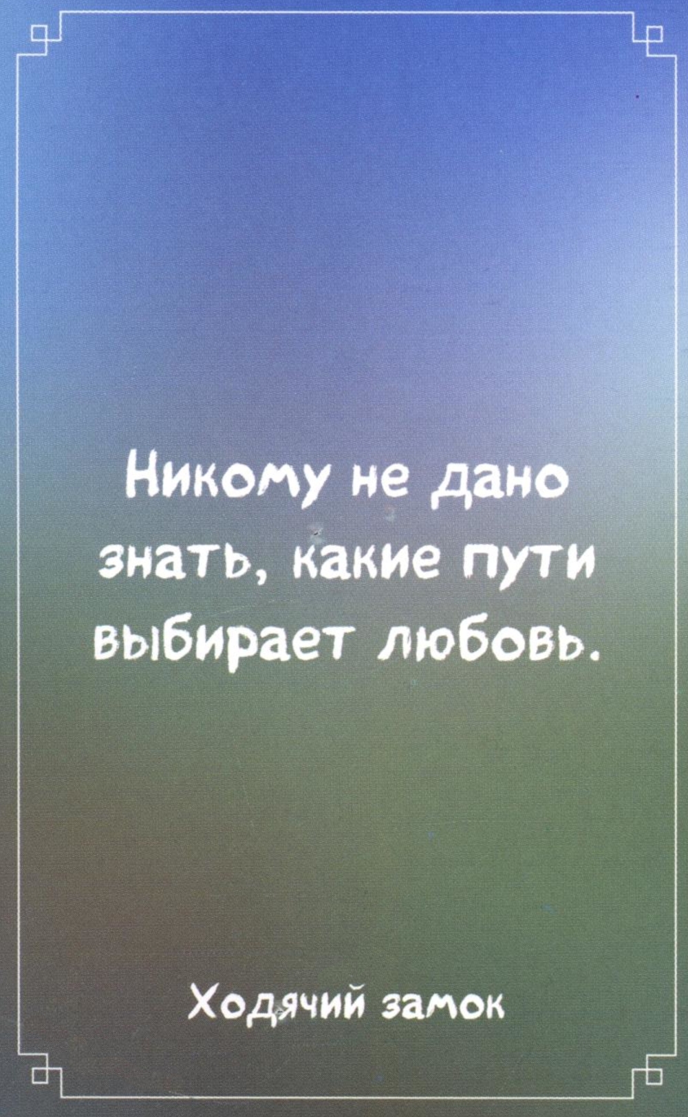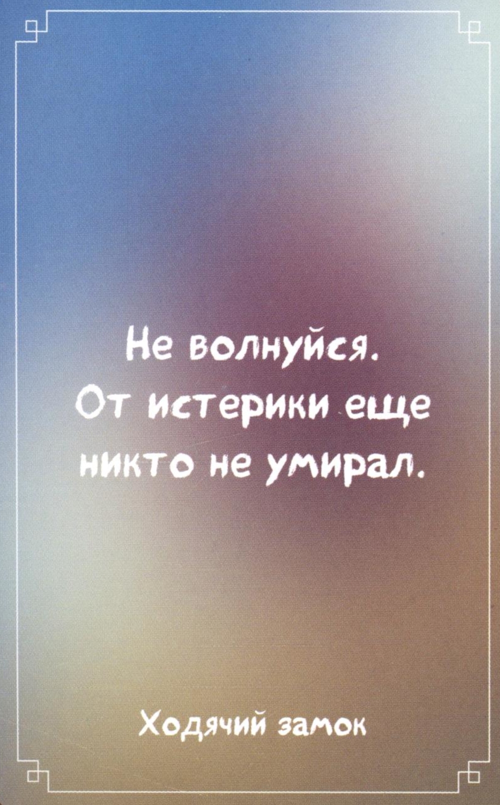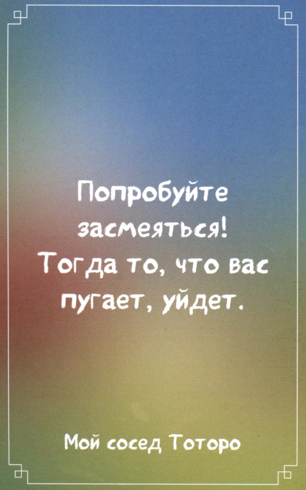 Мультфильмы Хаяо Миядзаки, великого японского аниматора - это истинные шедевры мирового кинематографа! Добрые, светлые и такие искренние, они заставляют каждого поверить, что мир, в котором мы живем, полон волшебства и необыкновенных вещей. В этих метафорических картах герои из «Моего соседа Тоторо», «Унесенных призраками», «Ведьминой службы доставки» и многих других аниме поделятся своей мудростью и добрыми советами, чтобы помочь вам найти ответы на свои вопросы. Пользоваться ими очень просто: достаньте случайную карту и прислушайтесь к внутреннему отклику на текст и изображение с персонажами из аниме. Их мудрость поможет вам взглянуть на ситуацию с разных сторон и принять решение, а также вдохновит на размышления. Волшебные свойства колоды: - 40 мудрых фраз из самых популярных мультфильмов авторства Хаяо Миядзаки; - красочные иллюстрации с любимыми героями на обороте каждой карты; - удобный миниатюрный формат, который приятно ложится в руку. Найдите путь к гармонии вместе с Тоторо, Хаулом, Кики и другими любимыми героями!| Издательство | Эксмо |