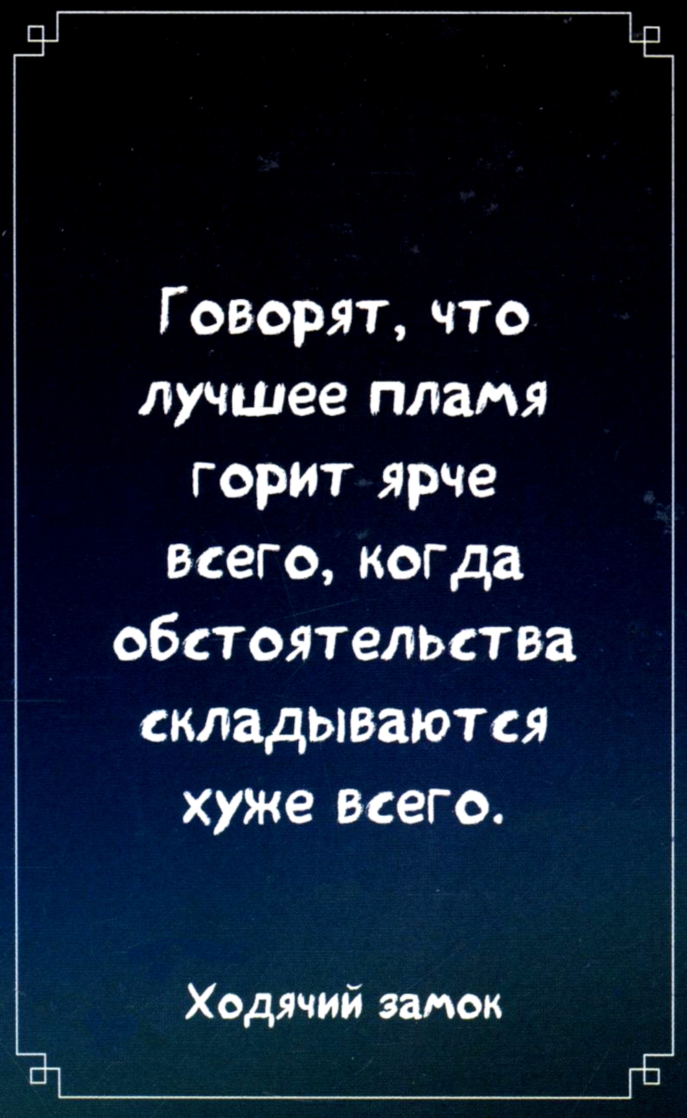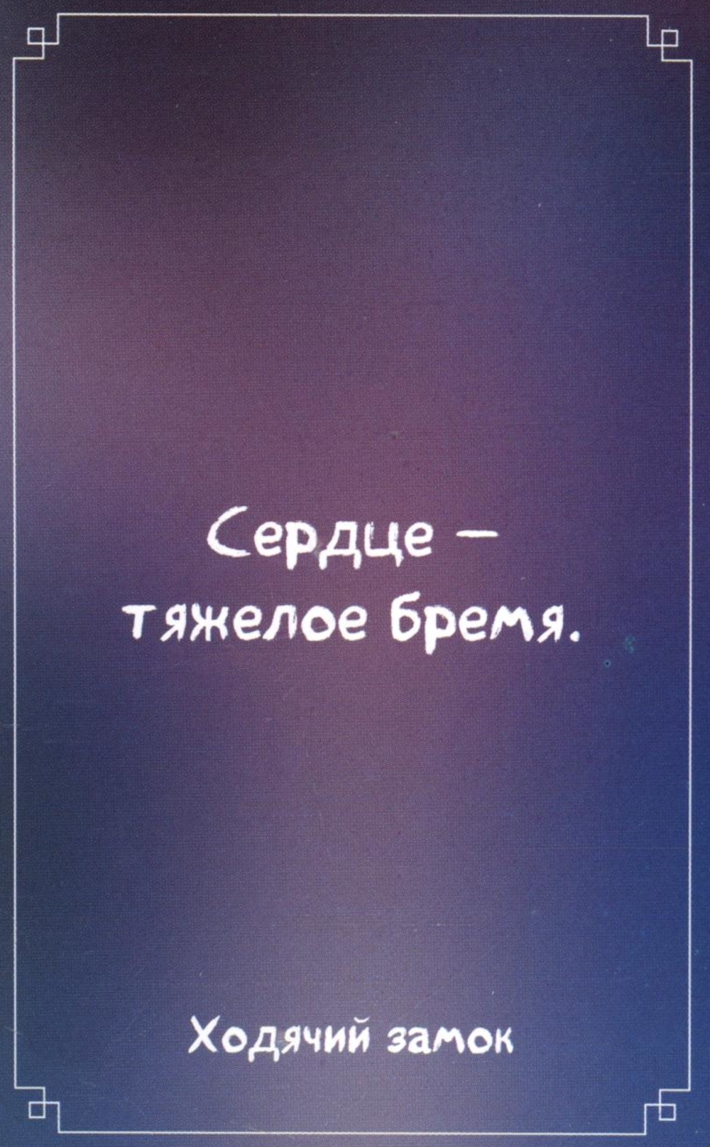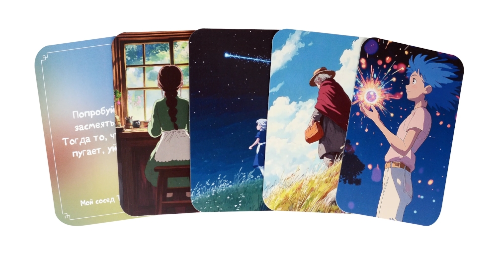 Мультфильмы Хаяо Миядзаки, великого японского аниматора - это истинные шедевры мирового кинематографа! Добрые, светлые и такие искренние, они заставляют каждого поверить, что мир, в котором мы живем, полон волшебства и необыкновенных вещей. В этих метафорических картах герои из «Моего соседа Тоторо», «Унесенных призраками», «Ведьминой службы доставки» и многих других аниме поделятся своей мудростью и добрыми советами, чтобы помочь вам найти ответы на свои вопросы. Пользоваться ими очень просто: достаньте случайную карту и прислушайтесь к внутреннему отклику на текст и изображение с персонажами из аниме. Их мудрость поможет вам взглянуть на ситуацию с разных сторон и принять решение, а также вдохновит на размышления. Волшебные свойства колоды: - 40 мудрых фраз из самых популярных мультфильмов авторства Хаяо Миядзаки; - красочные иллюстрации с любимыми героями на обороте каждой карты; - удобный миниатюрный формат, который приятно ложится в руку. Найдите путь к гармонии вместе с Тоторо, Хаулом, Кики и другими любимыми героями!| Издательство | Эксмо |