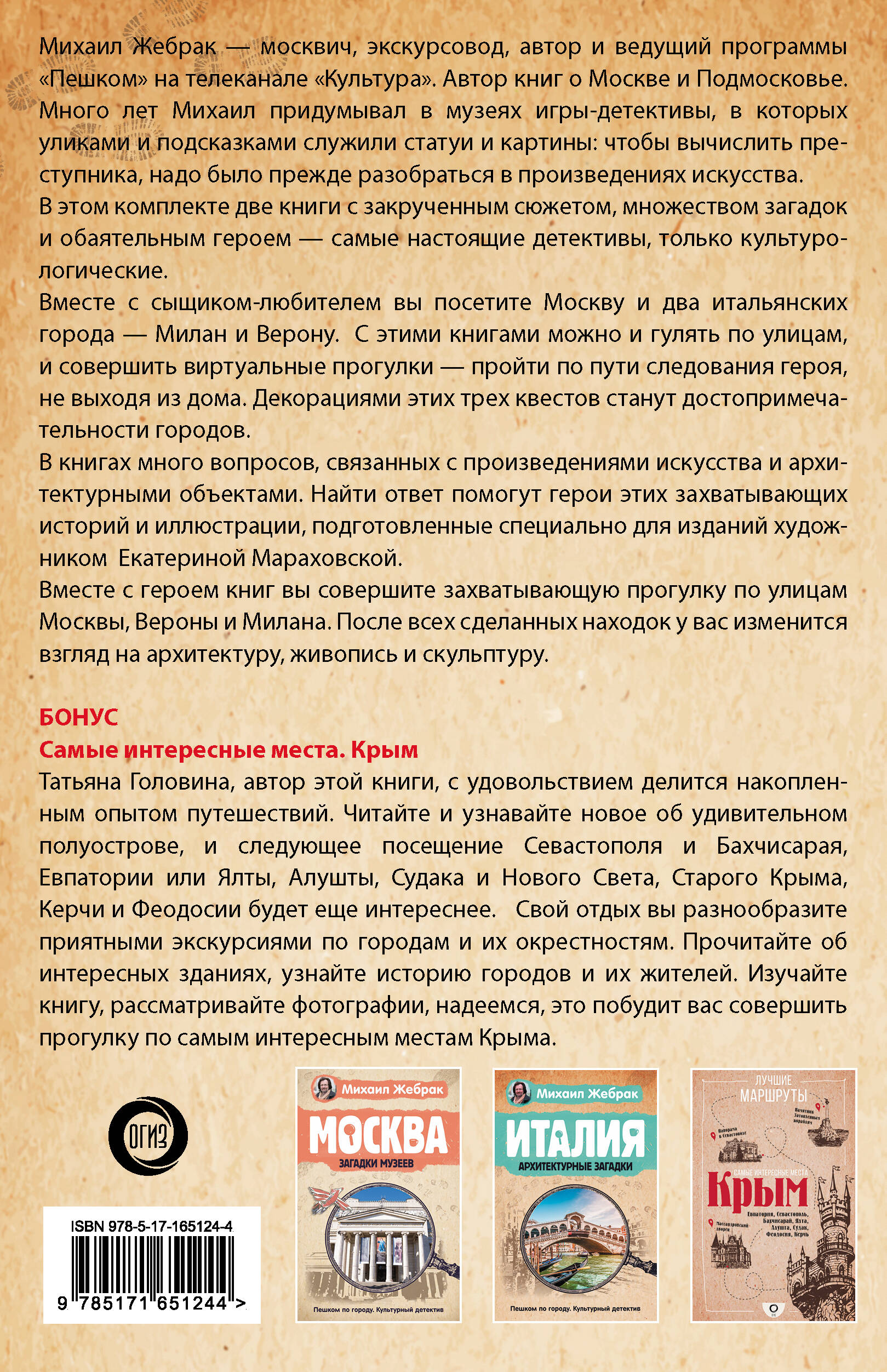 Михаил Жебрак - москвич, экскурсовод, автор и ведущий программы "Пешком" на телеканале "Культура". Автор книг о Москве и Подмосковье. Много лет Михаил придумывал в музеях игры-детективы, в которых уликами и подсказками служили статуи и картины: чтобы вычислить преступника, надо было прежде разобраться в произведениях искусства. В этом комплекте две книги с закрученным сюжетом, множеством загадок и обаятельным героем - самые настоящие детективы, только культурологические. Вместе с сыщиком-любителем вы посетите Москву и два итальянских города - Милан и Верону. С этими книгами можно и гулять по улицам, и совершить виртуальные прогулки - пройти по пути следования героя, не выходя из дома. Декорациями этих трех квестов станут достопримечательности городов. В книгах много вопросов, связанных с произведениями искусства и архитектурными объектами. Найти ответ помогут герои этих захватывающих историй и иллюстрации, подготовленные специально для изданий Екатериной Мараховской. Все места и шедевры в книгах подлинные, а все истории, произошедшие в этих зданиях с этими произведениями, выдуманные. Совпадения героев с реальными людьми может произойти благодаря фантазии читателя, а не по замыслу автора. Вместе с героем книг совершите захватывающую прогулку по улицам Москвы, Вероны и Милана. После всех сделанных находок, у вас изменится взгляд на архитектуру, живопись и скульптуру. БОНУС Самые интересные места. Крым Татьяна Головина, автор этой книги, с удовольствием делится накопленным опытом путешествий. Читайте и узнавайте новое об удивительном полуострове, и следующее посещение Севастополя и Бахчисарая, Евпатории или Ялты, Алушты, Судака и Нового Света, Старого Крыма, Керчи и Феодосии будет еще интереснее. Свой отдых вы разнообразите приятными экскурсиями по городам и их окрестностям. Прочитайте об интересных зданиях, узнайте историю городов и их жителей. Изучайте книгу, рассматривайте фотографии, надеемся, это побудит вас совершить прогулку по самым интересным местам Крыма.| Издательство | Издательство "АСТ" |