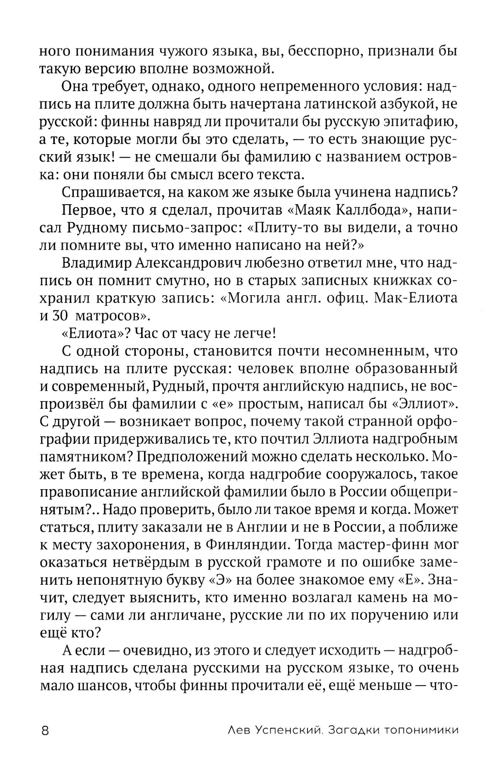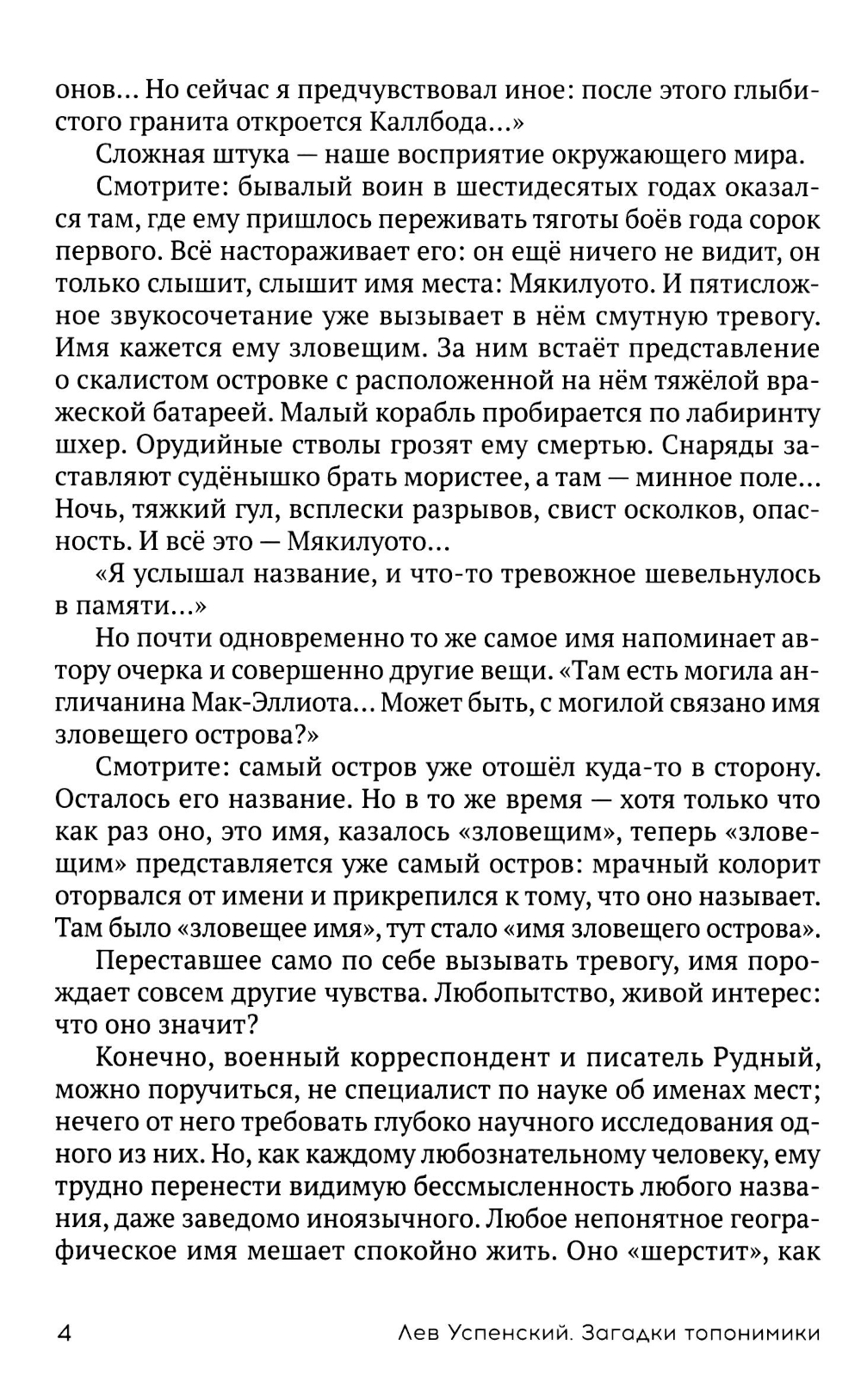 С детства слыша названия улиц, рек и городов, мы не задумываемся об их смысле и происхождении, в лучшем случае довольствуясь универсальным ответом: «Так исторически сложилось». О том, что означает эта фраза в топонимике, и рассказывает эта книга. На развитие языка влияют не только культурные, политические и социальные факторы, но и случайные события. Почему Москва стала Москвой? Где находится в Ленинграде улица Заячья Роща? Какое отчество у города Хабаровска и как с помощью карты собрать таблицу Менделеева? Известный лингвист Лев Успенский открывает завесу тайн над происхождением географических названий, каждое из которых имеет свои корни и подлинное историческое значение. Книга будет интересна учителям, студентам и исследователям в области гуманитарных наук, а также всем, кто интересуется языкознанием, историей и географией.