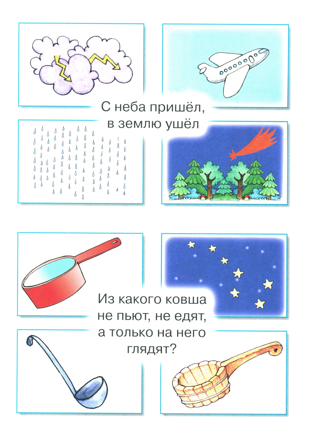 Важен не результат, а рассуждение. Эта книжка для родителей, которые хотят увидеть, как их ребенок рассуждает и ищет правильный ответ, отбраковывая неправильные. Вначале дети не всегда понимают, что загадка - это вопрос, и запоминают ответ, подсказанный взрослым. А затем из раза в раз транслируют этот ответ механически. Поэтому рекомендуем для начала не народные загадки (зачастую довольно сложные), а простые современные, с рифмованным ответом в конце. Эта книжка для детей, прошедших первый этап и уже готовых к процессу «размышления». На этом этапе, пожалуй, самая распространенная ошибка - неумение учесть все параметры загадки, они что-то упускают, хватаясь за отдельные определения. Например: «Летом серый, а зимой белый». Могут вспомнить белого медведя, не учитывая, что он белый и зимой, и летом. В этой книжке - на выбор 4 ответа. Один - традиционный правильный, второй (а бывает, и третий) - правильный, подходящий по всем критериям. Четвёртый - неправильный. Ребенок будет вынужден размышлять, чтобы разобраться, а взрослые, безусловно, должны помочь ему в этом. Вот, например, загадка «Без крыльев летят, без ног бегут, без паруса плывут». Как мы рассуждаем? Одна из картинок - звезды. Конечно, ребенок, да и мы, взрослые, не видим, чтобы они летели. А на самом деле они летят. Но мы никогда не говорим про них, что они бегут или плывут. Значит, этот ответ не подходит. Лодка, конечно, без паруса плывет, но не летит. Этот ответ отпадает. Воздушный змей точно летит - это дети знают. Но говорим ли мы, что змей бежит или плывет? В общем, это вполне допустимо. Но классический ответ - облака. Мы, а также поэты и писатели так и говорят про них, что они летят или плывут. Значит, здесь правомерны два ответа.