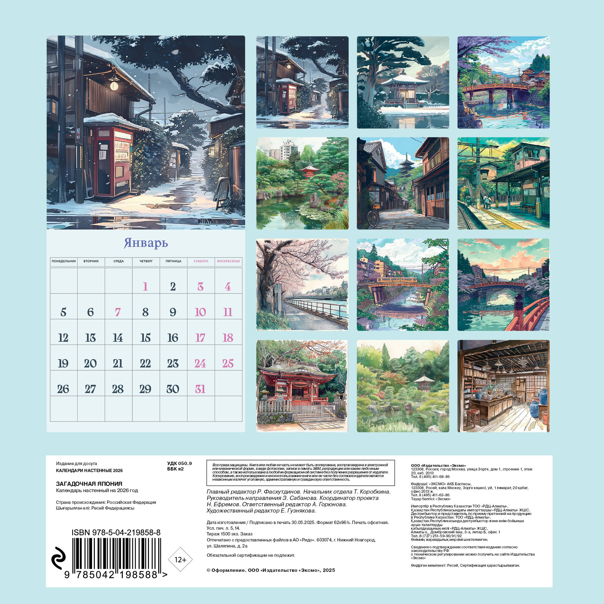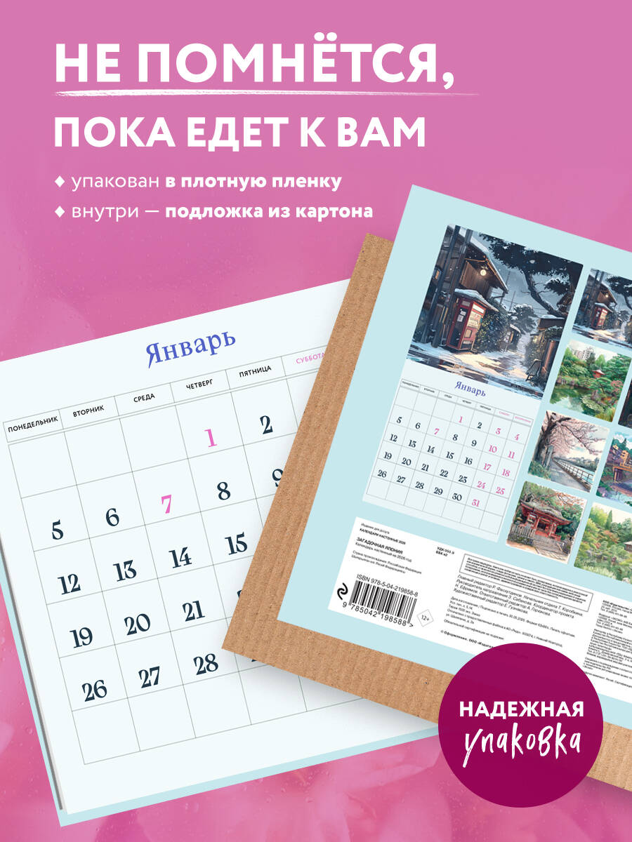 О календаре: Япония очаровывает каждого, кто хоть немного знаком с ней, своей уникальной культурой, удивительными традициями и особым эстетическим подходом к восприятию мира ее жителей. Вы тоже поддались очарованию Страны Восходящего Солнца? Тогда этот календарь точно будет вам по душе! Удивительные фото наполнят дом эстетикой Японии и создадут атмосферу умиротворения и вдохновения. Календарь дополнит ваш интерьер колоритом далекой страны и ее богатой культуры. О серии: Наши настенные календари отличаются высоким качеством исполнения! Тщательно подобранные иллюстрации, напечатанные на глянцевой бумаге высочайшего качества, станут настоящим украшением дома, а в календарной сетке найдется место для ваших планов: большие клетки позволят делать записи и организовать свой год! В календаре также отмечены все государственные праздники. В серии настенных календарей издательства «ЭКСМО» каждый найдет тему по вкусу: великие художники, великолепные подборки с самыми знаменитыми произведениями искусства, легендарные кинематографические саги и игры, главные книжные авторы и бестселлеры, фотографии и иллюстрации любимых животных и многое-многое другое! Технические параметры: • Тип календаря - настенный перекидной. • Год - 2026. • Календарная сетка - с разбивкой по месяцам. • Вид скрепления - скрепка. • Ширина - 17 см. • Высота - 17 см. • Внутренний блок - мелованная бумага 130 г/м2. • Подложка - плотный гофрокартон для поддержания формы. • Индивидуальная упаковка в плотный целлофановый пакет.| Издательство | ООО "Издательство "Эксмо" |