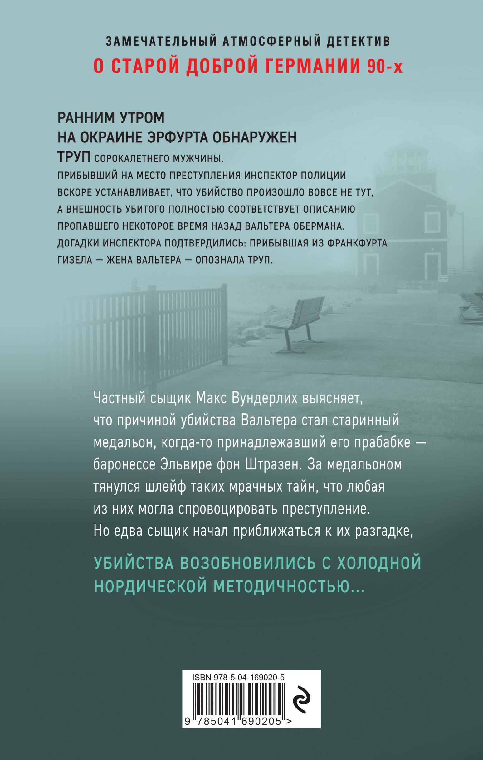 Замечательный атмосферный детектив о старой доброй Германии 90-х, когда жизнь казалась беззаботной, милой и вечной. Ранним утром на окраине Эрфурта обнаружен труп сорокалетнего мужчины. Прибывший на место преступления инспектор полиции вскоре устанавливает, что убийство произошло вовсе не тут, а внешность убитого полностью соответствует описанию пропавшего некоторое время назад Вальтера Обермана. Догадки инспектора подтвердились: прибывшая из Франкфурта Гизела - жена Вальтера - опознала труп. Частный сыщик Макс Вундерлих выясняет, что причиной убийства Вальтера стал старинный медальон, когда-то принадлежащий его прабабке - баронессе Эльвире фон Штразен. За медальоном тянулся шлейф таких мрачных тайн, что любая из них могла спровоцировать преступление. Но едва сыщик начал приближаться к их разгадке, убийства возобновились с холодной нордической методичностью…| Издательство | ООО "Издательство "Эксмо" |