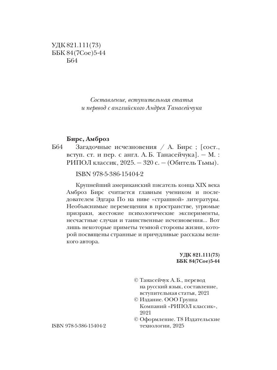 Крупнейший американский писатель конца XIX века, Амброз Бирс считается главным учеником и последователем Эдгара По на ниве «литературы ужасов». Необъяснимые перемещения в пространстве, угрюмые призраки, жестокие психологические эксперименты, несчастные случаи и таинственные исчезновения… Вот лишь некоторые приметы темной стороны жизни, которой посвящены странные и причудливые рассказы великого литератора.| Издательство | Рипол Классик |