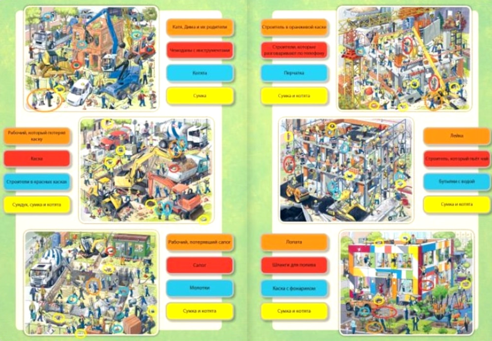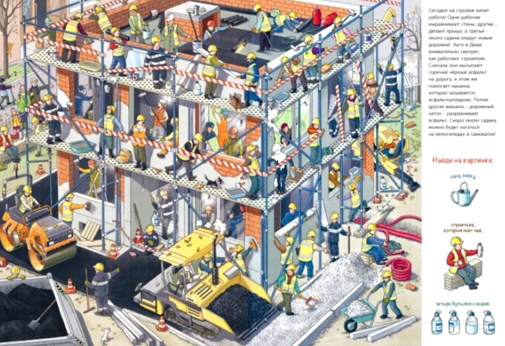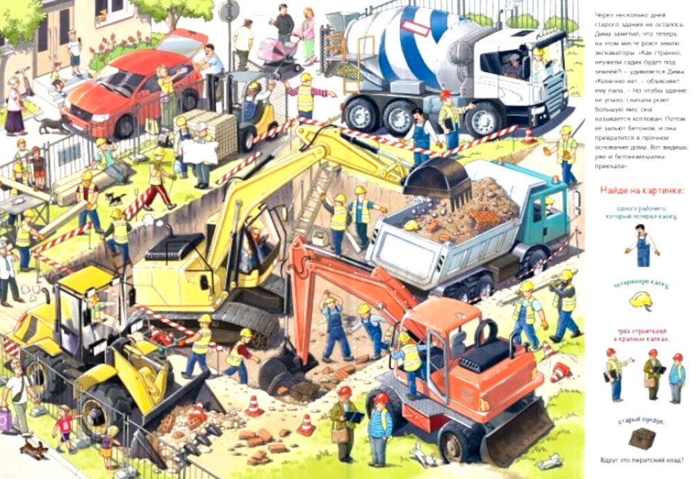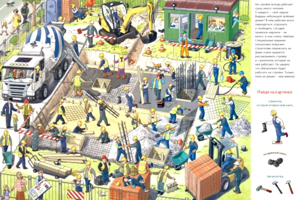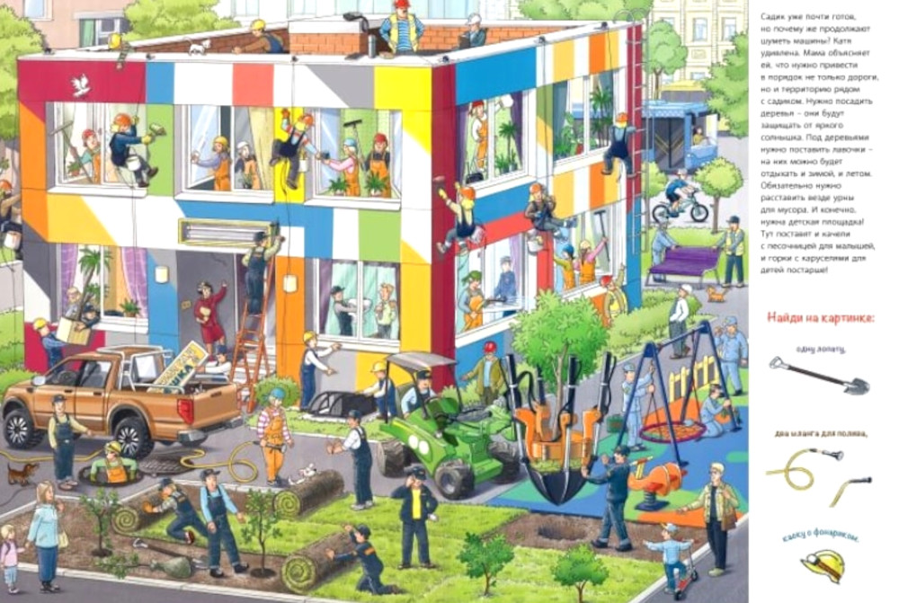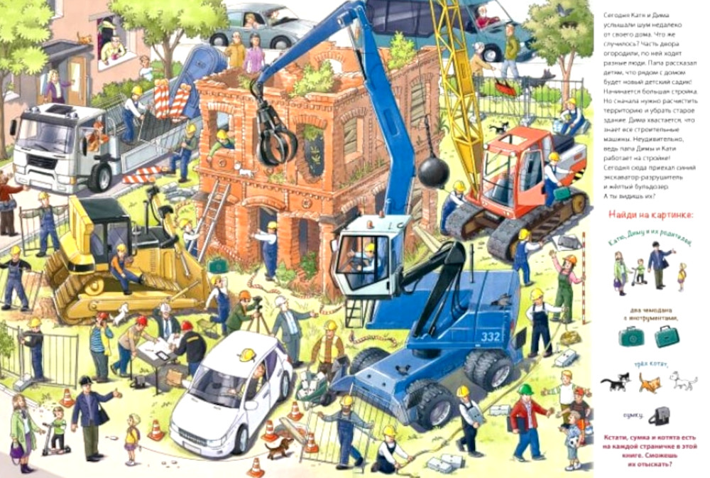 Рядом с домом Кати и Димы строят новый дом - здесь будет детский сад! Заглянем вместе с ребятами на стройку? Мы посмотрим, как идет строительство, и увидим, сколько всего интересного там происходит. На стройке всегда кипит работа. Здесь трудится множество рабочих. А сколько тут разных машин, инструментов и всевозможных приспособлений! Рассмотри книжку внимательно и найди каждое из них.
