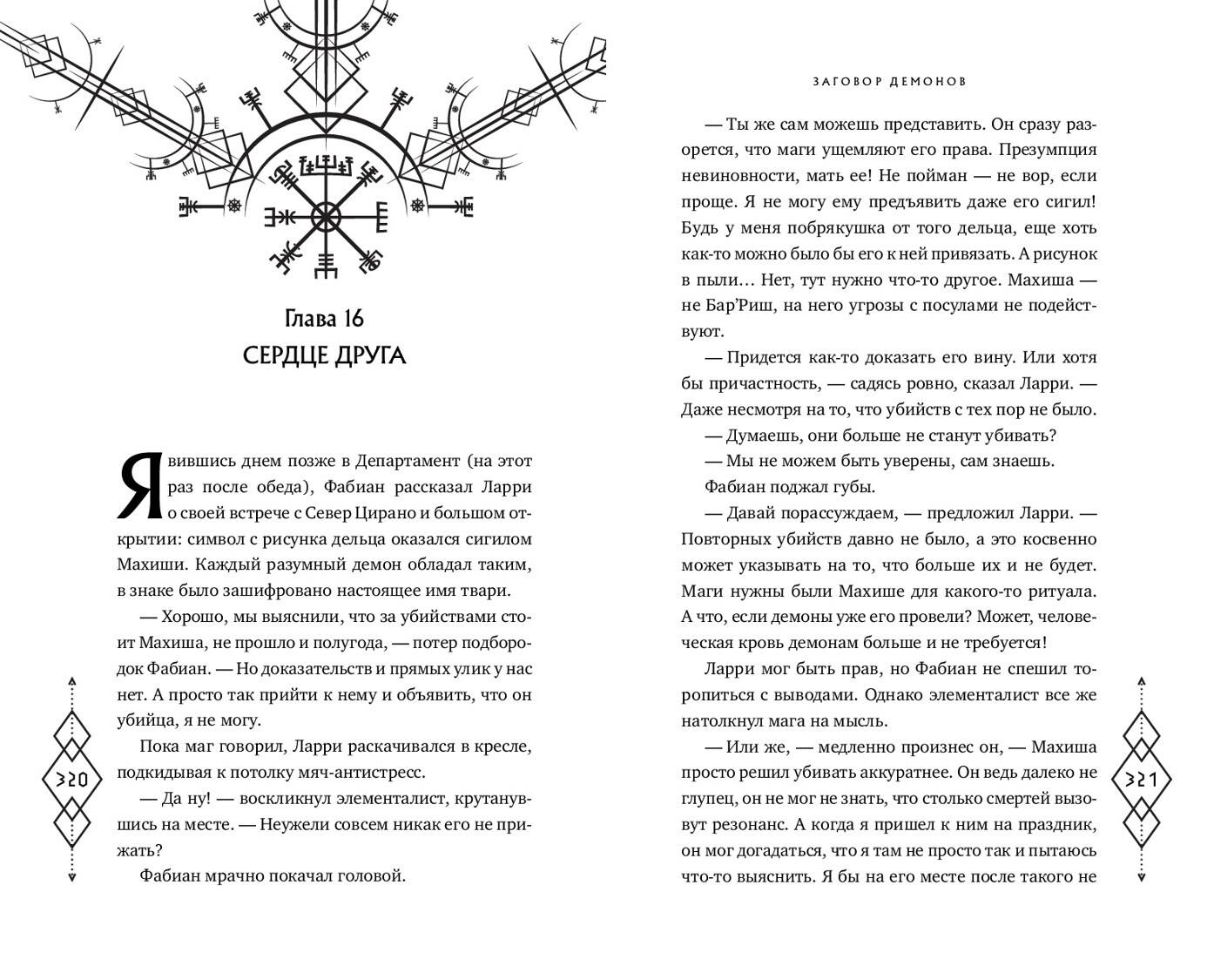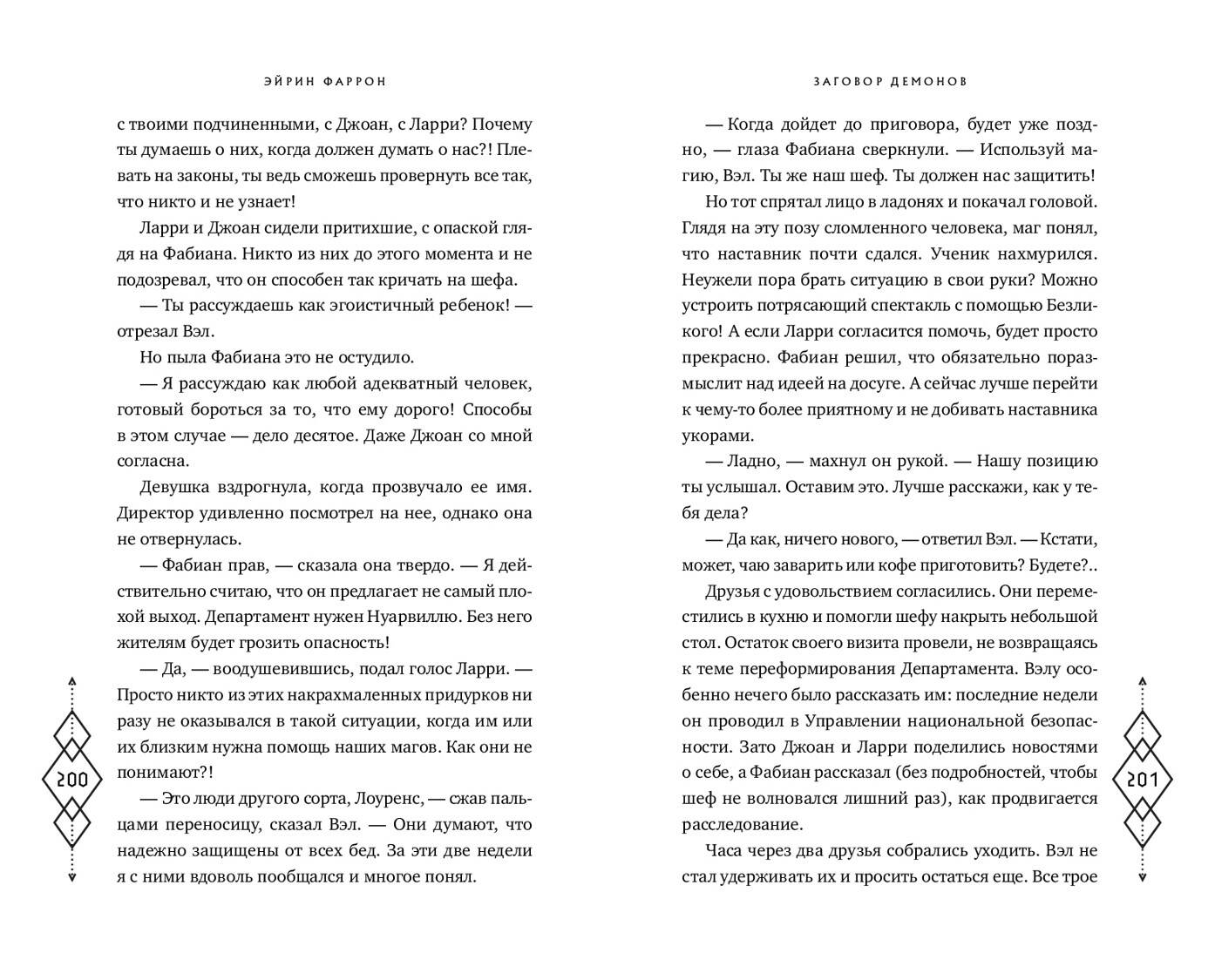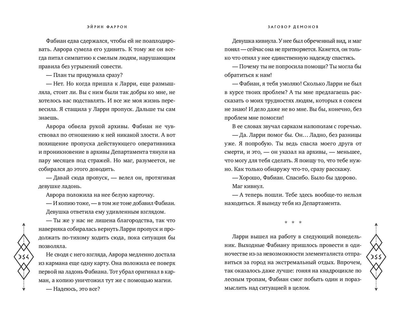 «Заговор демонов» - продолжение городского фэнтези «Клан теней» Эйрин Фаррон. Новое расследование, магия, демоны, вампиры, ритуалы. Два мира, реальный и демонический, существуют рядом друг с другом уже тысячи лет. Темная сторона города живет по своим правилам, но если кто-то представляет опасность, в игру вступает Департамент мистических расследований. В Нуарвилле вновь неспокойно: неизвестный убивает магов, оставляя обескровленные тела. Серию таинственных и жестоких убийств поручают раскрыть Фабиану, одному из лучших сотрудников Департамента. Под подозрением оказывается клан вампиров, но так ли это на самом деле? Фабиан не замечает, как становится зависим от магии и теряет контроль над Безликим. Чародея все сильнее затягивает в трясину, и даже Джоан не в силах его спасти. Тем временем служители зла наносят Фабиану финальный удар и пробуждают силу, равную мощи самого дьявола. Вторая часть серии «Туманы Нуарвилля»! В книгу добавятся карта и иллюстрации Эйрин Фаррон. Иллюстратор обложки: Саша Рейн.