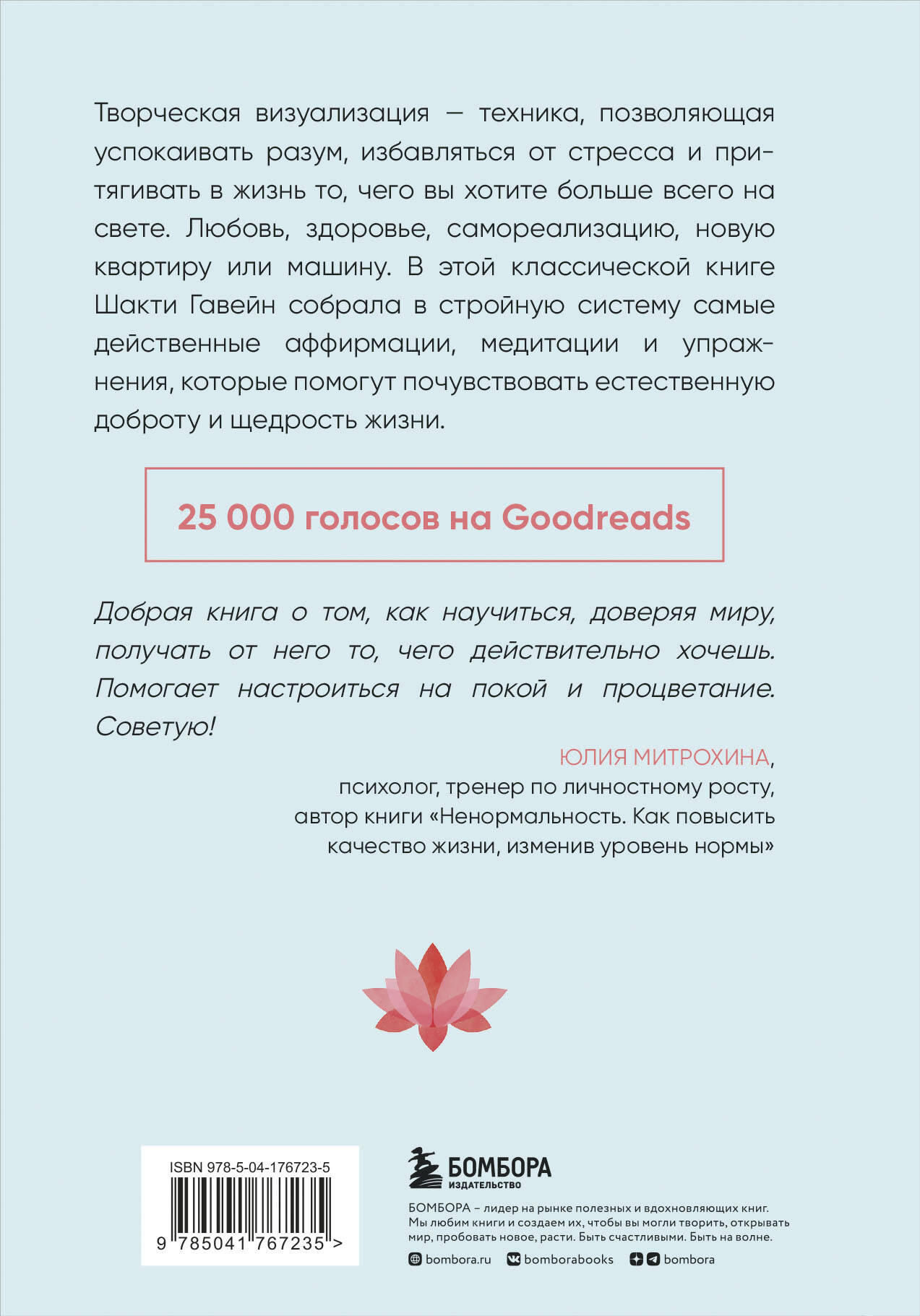 Творческая визуализация - техника, позволяющая успокаивать разум, избавляться от стресса и притягивать в жизнь то, чего вы хотите больше всего на свете. Любовь, здоровье, самореализацию, новую квартиру или машину. В этой классической книге Шакти Гавейн собрала в стройную систему самые действенные аффирмации, медитации и упражнения, которые помогут почувствовать естественную доброту и щедрость жизни. Добрая книга о том, как научиться, доверяя миру, получать от него то, чего действительно хочешь. Помогает настроиться на покой и процветание. Советую! ЮЛИЯ МИТРОХИНА, психолог, тренер по личностному росту, автор книги «Ненормальность. Как повысить качество жизни, изменив уровень нормы»