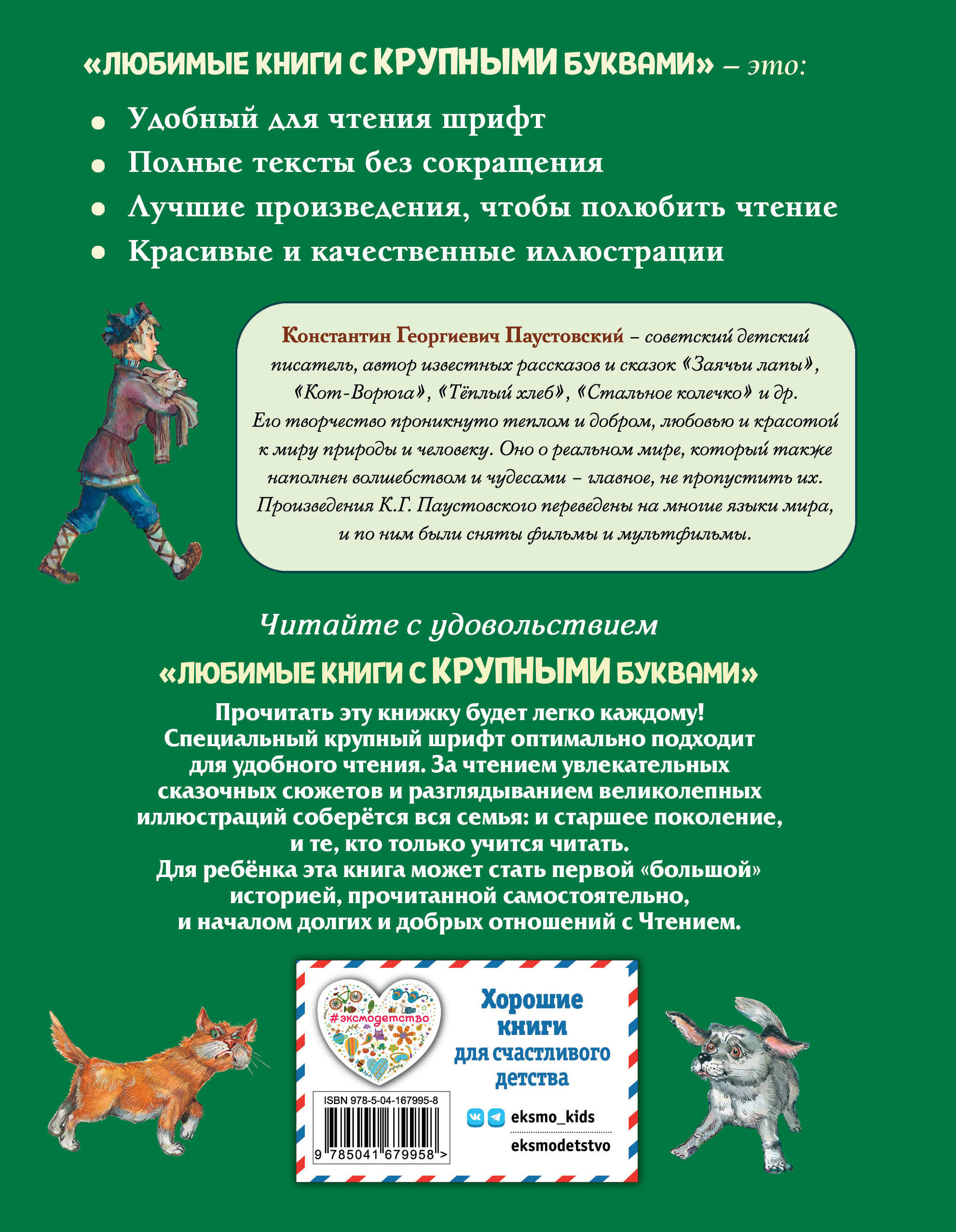 Почему Дремучий медведь лишился своего хвоста? Как барсук лечил свой обожжённый нос? Можно ли перевоспитать кота-ворюгу? В чём провинилась резиновая лодка перед Мурзиком? Какие секреты таят жильцы старого дома? Эти и многие другие секреты открывает маленьким и любознательным читателям этот замечательный сборник рассказов о животных. ОБ АВТОРЕ Константин Паустовский - советский писатель-натуралист. Автор известных сказок, повестей и рассказов о природе и животных. Несколько раз был номинирован на Нобелевскую премию по литературе. Его книги неоднократно были переведены на многие языки мира и экранизированы в виде мультфильмов и кинофильмов. О ЧЁМ КНИГА 7 рассказов о природе, которые приоткроют завесу тайны над повседневной жизнью лесных и домашних животных, научат отваге, стойкости, силе духа, взаимовыручке, отзывчивости и покажут, что окружающий человека мир и без всякого волшебства полон неразгаданных тайн, а невероятные и удивительные открытия поджидают на каждом шагу. ОСОБЕННОСТИ КНИГИ • Крупный и удобный шрифт для чтения. • Произведения из сборника входят в школьную программу и список по внеклассному чтению. • Идеально подходит для первого самостоятельного чтения. • Отличный вариант для первого знакомства ребёнка с рассказами о природе. • Яркие цветные иллюстрации современного российского художника Александра Кардашука. О СЕРИИ «Любимые книги с крупными буквами» - это полные тексты классических произведений детской литературы, крупный и удобный для чтения шрифт, позволяющий ребёнку читать книгу как со взрослыми, так и самостоятельно.