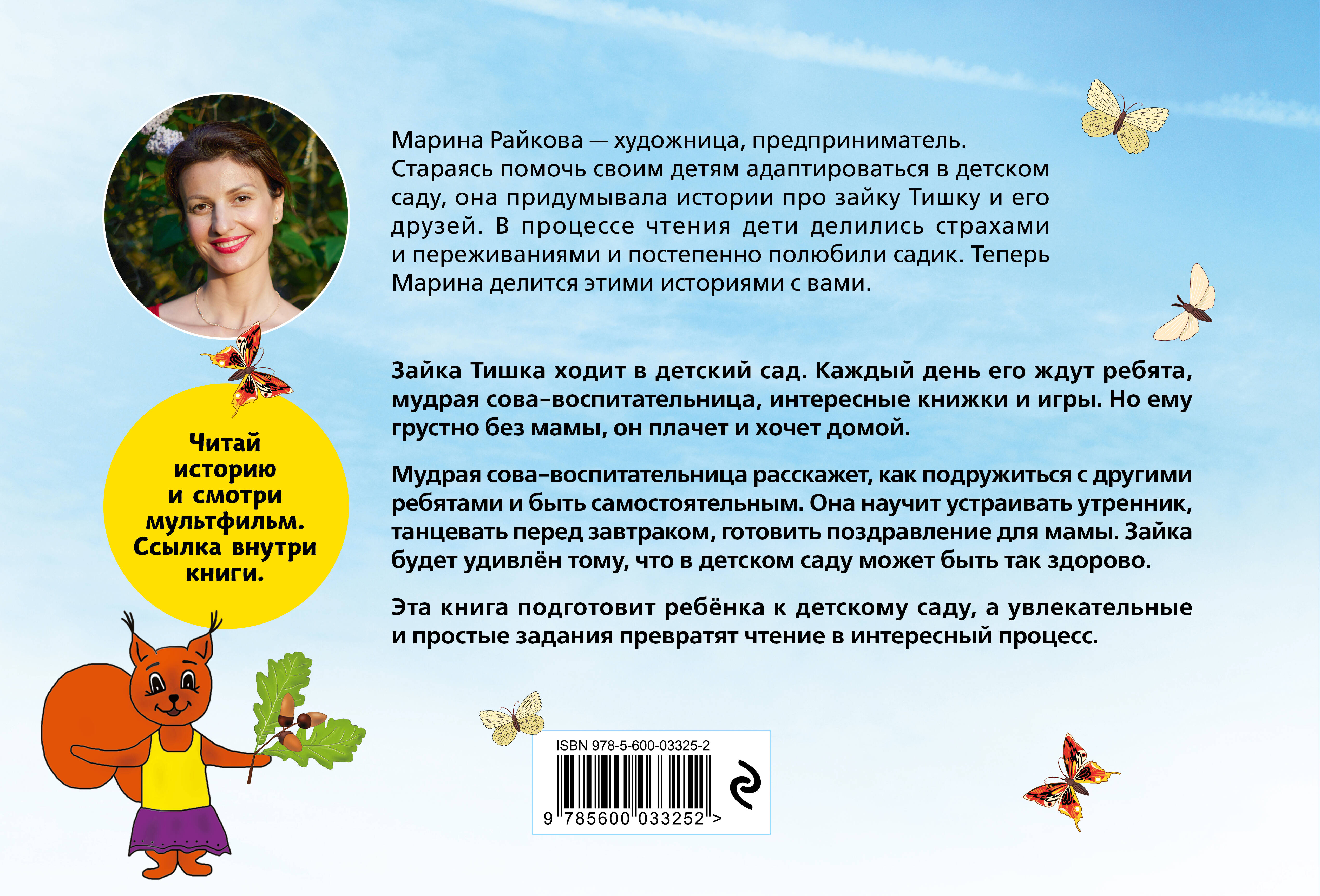 Зайка Тишка уже совсем взрослый. Он ходит в детский сад. Каждый день его ждут ребята, мудрая сова-воспитательница, интересные книжки и игры. Но его ничего не радует. Зайке грустно без мамы, он плачет и хочет домой. Эта книга подготовит ребёнка к детскому саду, расскажет о том, как подружиться с другими ребятами и быть самостоятельным. Увлекательные и простые задания, ссылки на песенки и мультики сделают процесс интересным. Для семейного чтения.| Издательство | ООО "Издательство "Эксмо" |