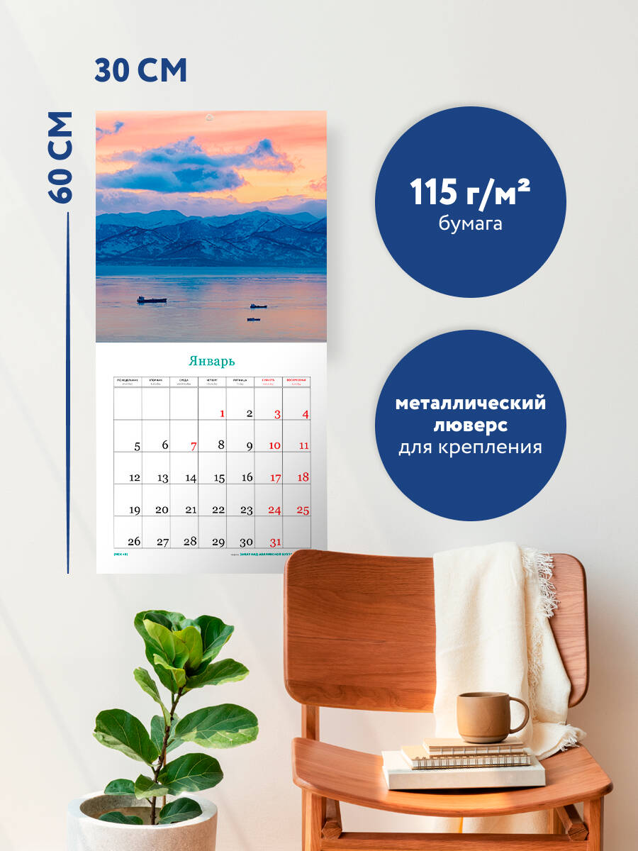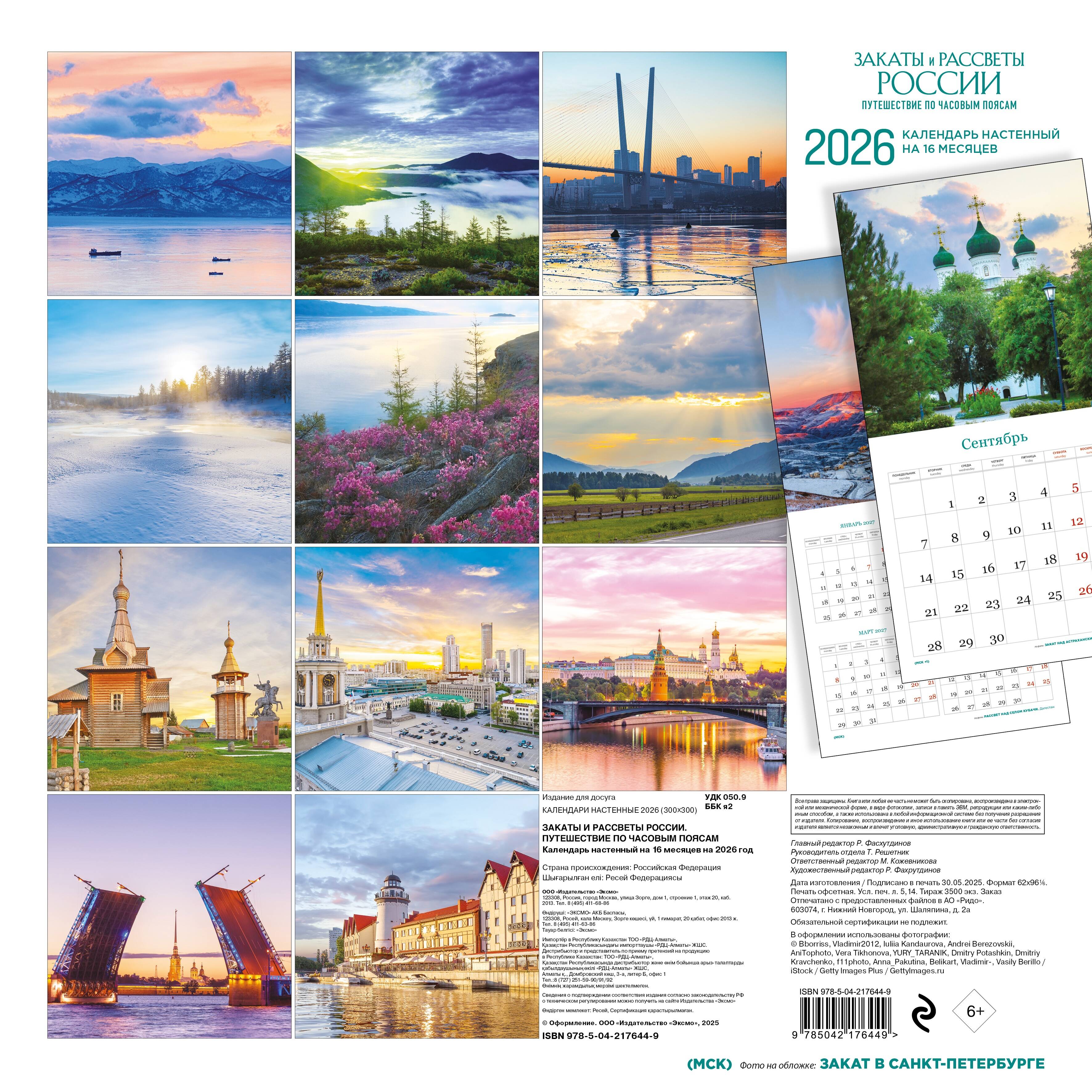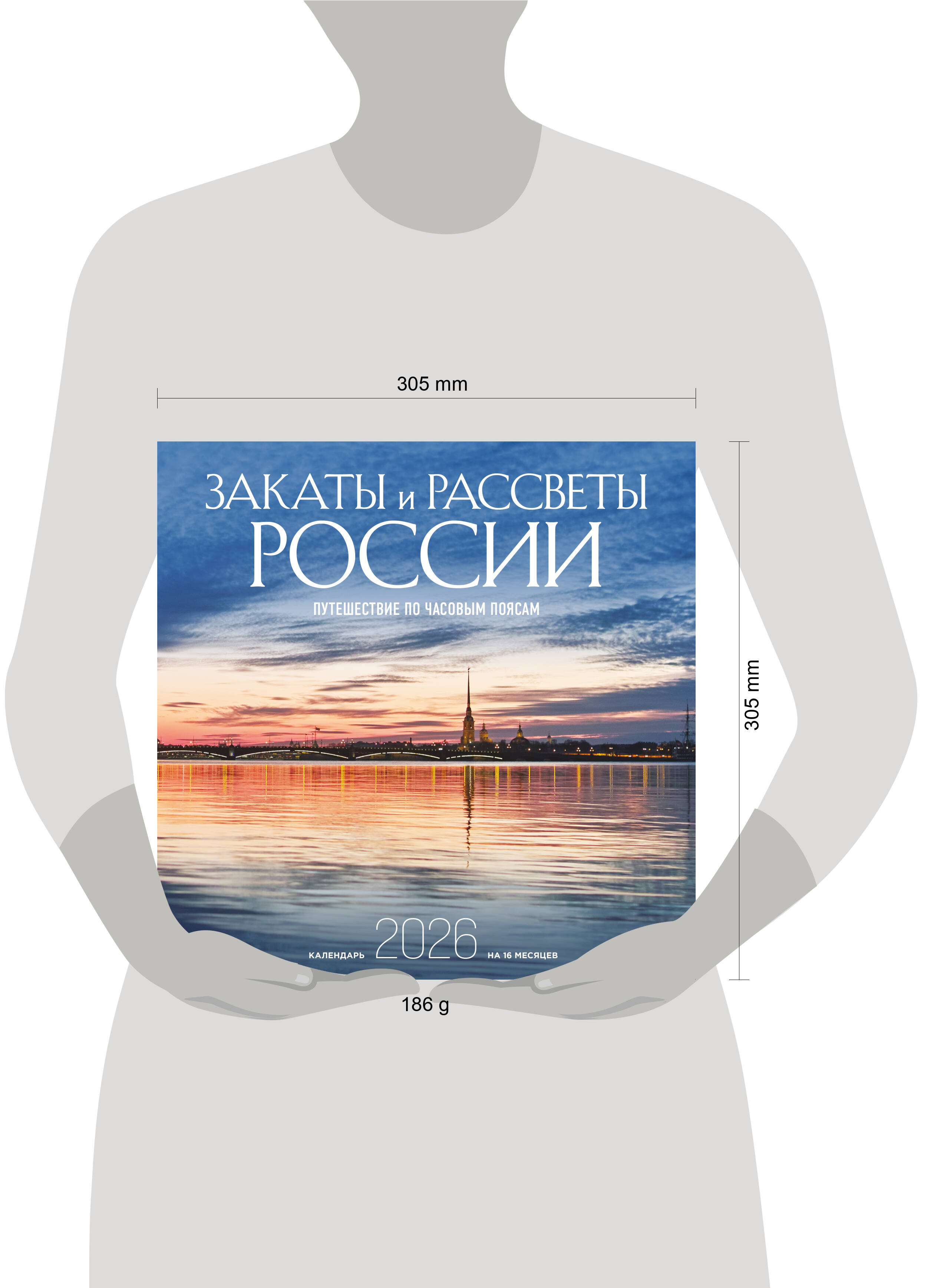 О серии: Наши настенные календари отличаются высоким качеством исполнения! Тщательно подобранные иллюстрации, напечатанные на глянцевой бумаге высочайшего качества, станут настоящим украшением дома, а в календарной сетке найдется место для ваших планов: большие клетки позволят делать записи и организовать свой год! В календаре также отмечены все государственные праздники. В серии настенных календарей издательства «ЭКСМО» каждый найдет тему по вкусу: великие художники, великолепные подборки с самыми знаменитыми произведениями искусства, легендарные кинематографические саги и игры, главные книжные авторы и бестселлеры, фотографии и иллюстрации любимых животных и многое-многое другое! О календаре: Россия - невероятная и самая большая страна в мире, которая простирается на многие тысячи километров с запада на восток. Благодаря этому на территории нашей страны есть целых 11 часовых поясов. Первыми рассвет, как и Новый год, встречают на Чукотке и Камчатке - по сравнению с Москвой там +9 часов. А в Калининградскую область, наоборот, Новый год приходит позже всего - там -1 час по сравнению со столицей. Это создает удивительное разнообразие в моментах восхода и заката солнца, которые можно наблюдать в совершенно разных уголках страны. И в каждом месте закаты и рассветы будут особенными. В календаре собраны фотографии самых красивых рассветов и закатов нашей страны, выбранные из каждого часового пояса, чтобы вы могли удивиться разнообразию красот России. Отправляйтесь исследовать вулканы Камчатки, шедевры деревянного зодчества Сибири, бесконечные леса Якутии или архитектуру всеми любимого Петербурга! Также в календарь включен дополнительный разворот с первыми четырьмя месяцами 2027 года! Для кого: Для всех любителей путешествий и ценителей красоты нашей невероятной страны. Технические параметры: - Тип календаря - настенный перекидной. - Год - 2026. - Календарная сетка - с разбивкой по месяцам. - Вид скрепления - скрепка. - Ширина - 30 см. - Высота - 30 см. - Внутренний блок - мелованная бумага 115 г/м2. - Подложка - плотный гофрокартон для поддержания формы. - Индивидуальная упаковка в плотный целлофановый пакет.| Издательство | ООО "Издательство "Эксмо" |