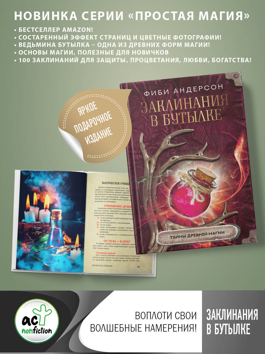 Воплоти свои волшебные желания с помощью заклинаний в бутылке! Ведьмина бутылка - древняя форма магии, которая популярна до сих пор. Из книги вы узнаете много полезного: • как с помощью ведьминых бутылок защищаться и изгонять негатив, привлекать любовь, счастье, благополучие и уверенность • как сочетать в заклинаниях волшебные свойства трав, кристаллов, цвета, чисел, дней недели, лунных циклов • как подобрать подходящие волшебные инструменты и ингредиенты, очистить и зарядить магический сосуд • как создать магический круг и священный алтарь, развить экстрасенсорные способности и сформулировать волшебное намерение После прочтения книги вы овладеете волшебной силой, которая наполнит вашу жизнь благополучием! Яркое издание c золотым тиснением, блинтом и эффектом состаренных страниц станет отличным подарком для начинающих ведьм!| Издательство | ИЗДАТЕЛЬСТВО "АСТ" |