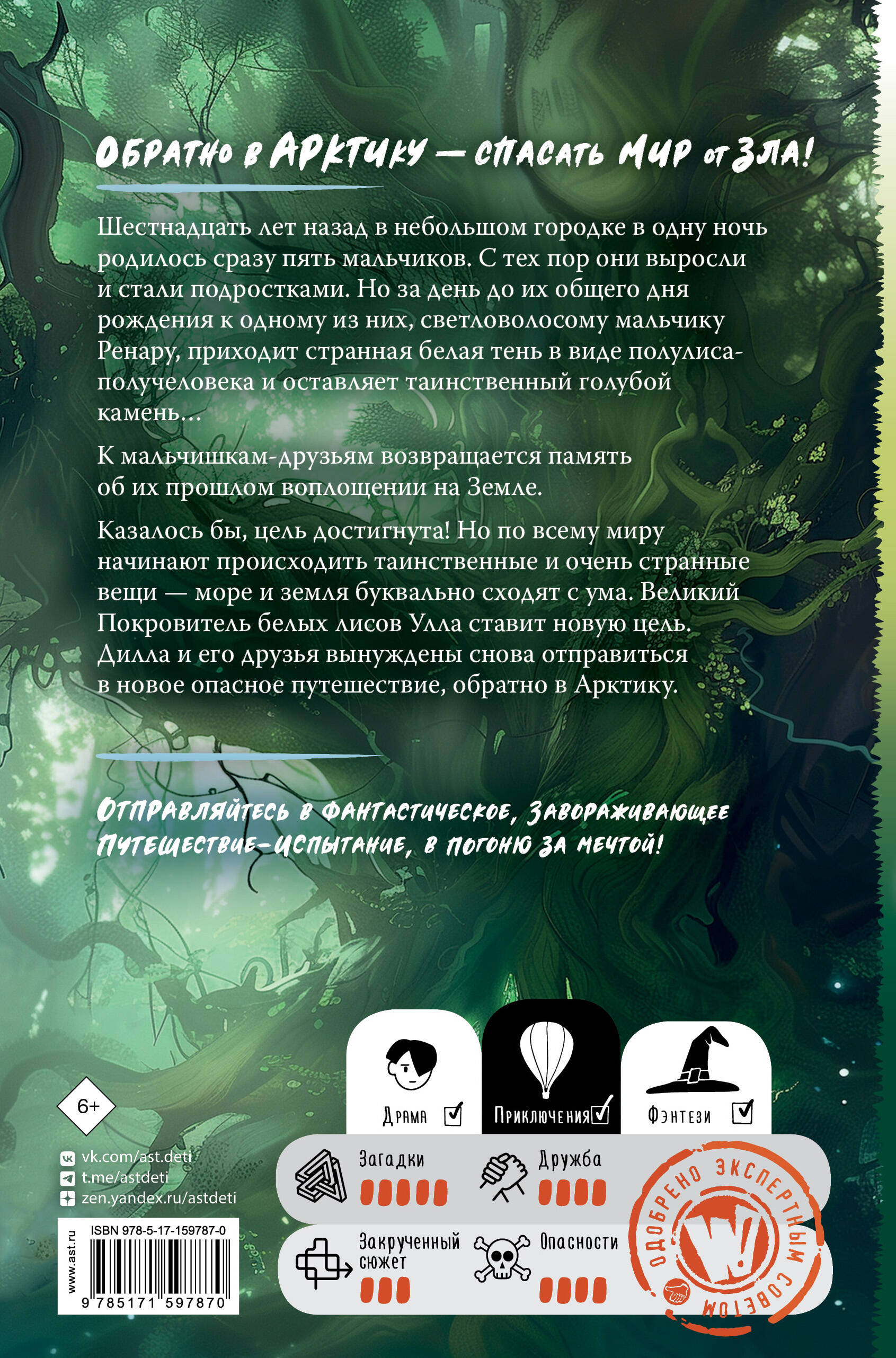 Шестнадцать лет назад в небольшом городке в одну ночь родились сразу пять мальчиков. С тех пор они выросли и стали подростками. Но за день до их общего дня рождения к одному из них, светловолосому мальчику Ренару, приходит странная белая тень в виде полулиса-получеловека и оставляет таинственный голубой камень… К мальчишкам-друзьям возвращается память об их прошлом воплощении на Земле. Казалось бы, цель достигнута! Но по всему миру начинают происходить таинственные и очень странные вещи - море и земля буквально сходят с ума. Великий Покровитель белых лисов Улла ставит новую цель. Дилла и его друзья вынуждены снова отправиться в новое опасное путешествие, обратно в Арктику.| Издательство | Издательство "АСТ" |
