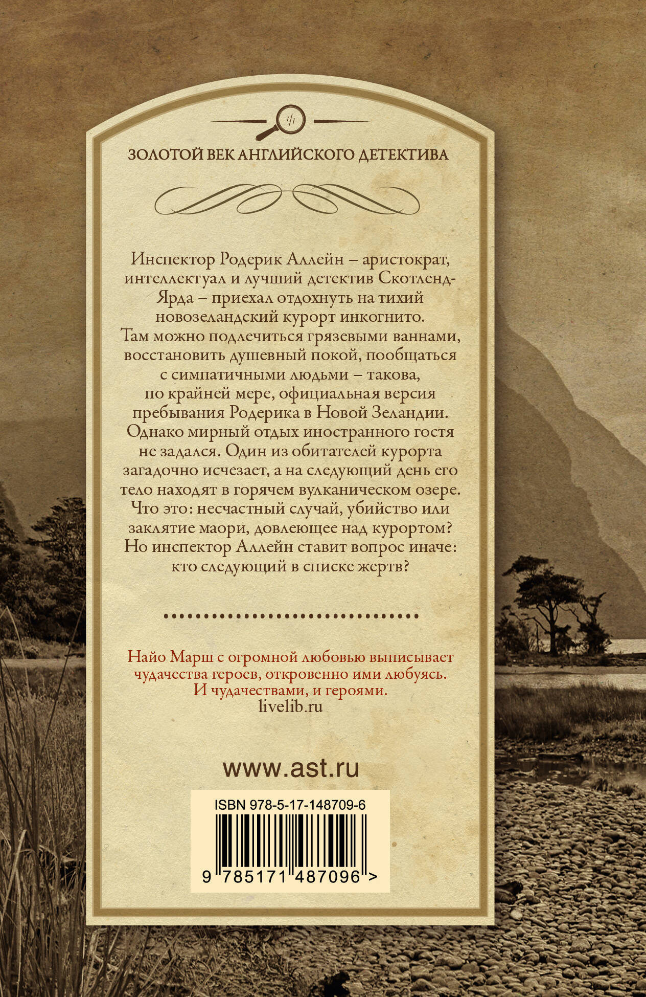 Инспектор Родерик Аллейн - аристократ, интеллектуал и лучший детектив Скотленд-Ярда - приехал отдохнуть на тихий новозеландский курорт инкогнито. Там можно подлечиться грязевыми ваннами, восстановить душевный покой, пообщаться с симпатичными людьми - такова, по крайней мере, официальная версия пребывания Родерика в Новой Зеландии. Однако мирный отдых иностранного гостя не задался. Один из обитателей курорта загадочно исчезает, а на следующий день его тело находят в горячем вулканическом озере. Что это: несчастный случай, убийство или заклятие маори, довлеющее над курортом? Но инспектор Аллейн ставит вопрос иначе: кто следующий в списке жертв?| Издательство | АСТ |