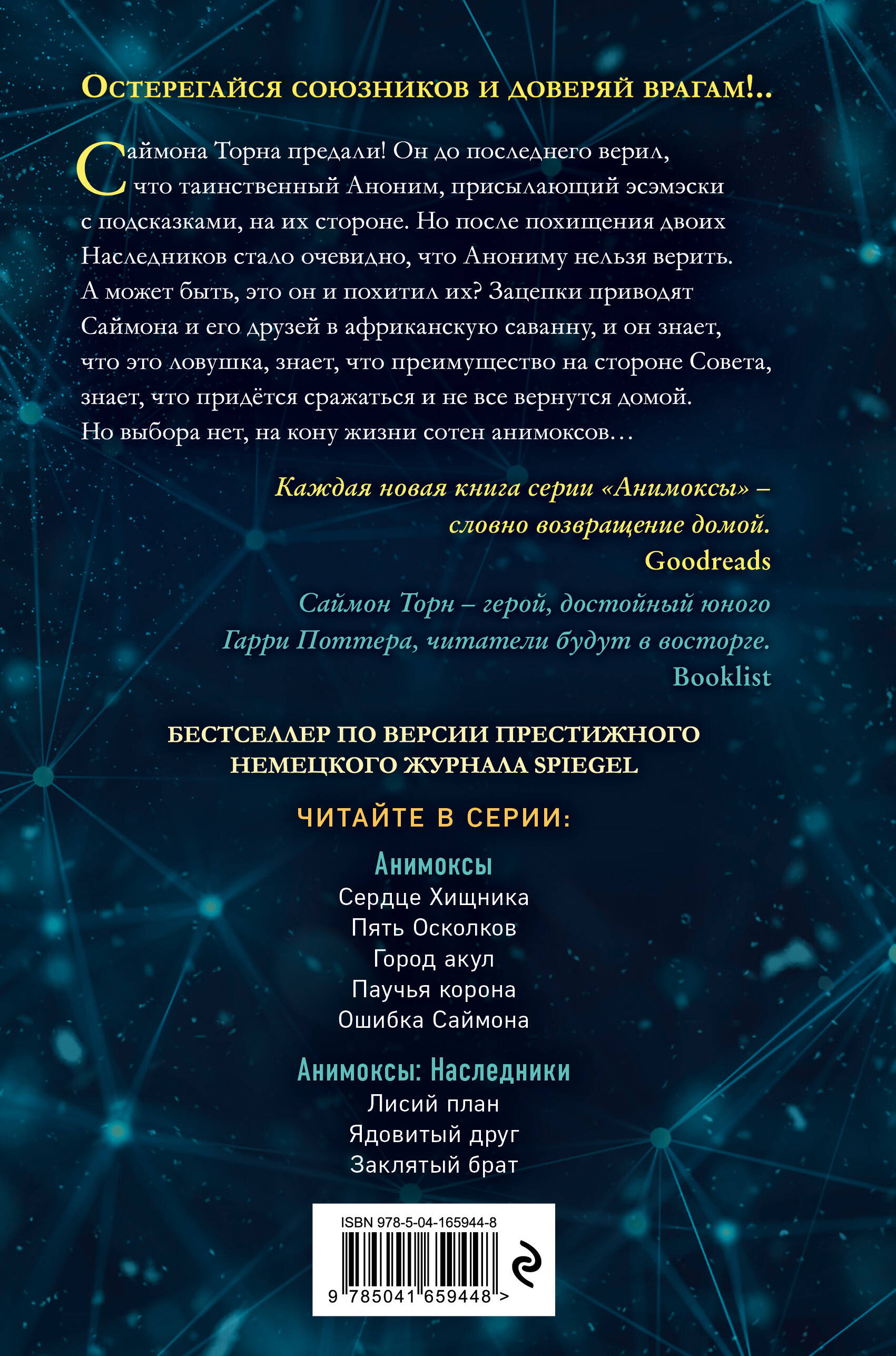 Саймона Торна предали! Он до последнего верил, что таинственный Аноним, присылающий эсэмэски с подсказками, на их стороне. Но после похищения двоих Наследников стало очевидно, что Анониму нельзя верить. А может быть, это он и похитил их? Зацепки приводят Саймона и его друзей в африканскую саванну, и он знает, что это ловушка, знает, что преимущество на стороне Совета, знает, что придётся сражаться и не все вернутся домой. Но выбора нет, на кону жизни сотен Наследников… Приключения анимоксов продолжаются! Бестселлер по версии престижного журнала Spiegel. Третья книга цикла «Анимоксы: Наследники».| Издательство | ООО "Издательство "Эксмо" |