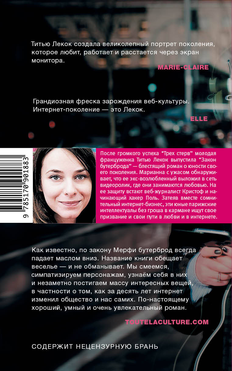 После громкого успеха и шестизначных тиражей "Трех стерв" молодая француженка Титью Лекок выпустила "Закон бутерброда" - блестящий роман о первом интернет-поколении. Юность ее героев, фанатов интернета, совпала с юностью самого интернета, взрослевшего вместе с ними. Все начинается в 2006 году. Студентка-блогерша Марианна с ужасом обнаруживает, что ее экс-возлюбленный из мести выложил на YouPorn ролик, где они занимаются любовью, и там отчетливо видно ее лицо. На защиту Марианны встают вебжурналист Кристоф и начинающий хакер Поль, призванный на помощь, чтобы удалить ролик и отомстить обидчику. Их встреча становится началом дружбы, сомнительного интернет-бизнеса и запутанных отношений, получающих неожиданное продолжение девять лет спустя. Этот "роман с интернетом" выдвинул Титью Лекок в первый ряд восходящих литературных звезд.| Издательство | Издательство "АСТ" |