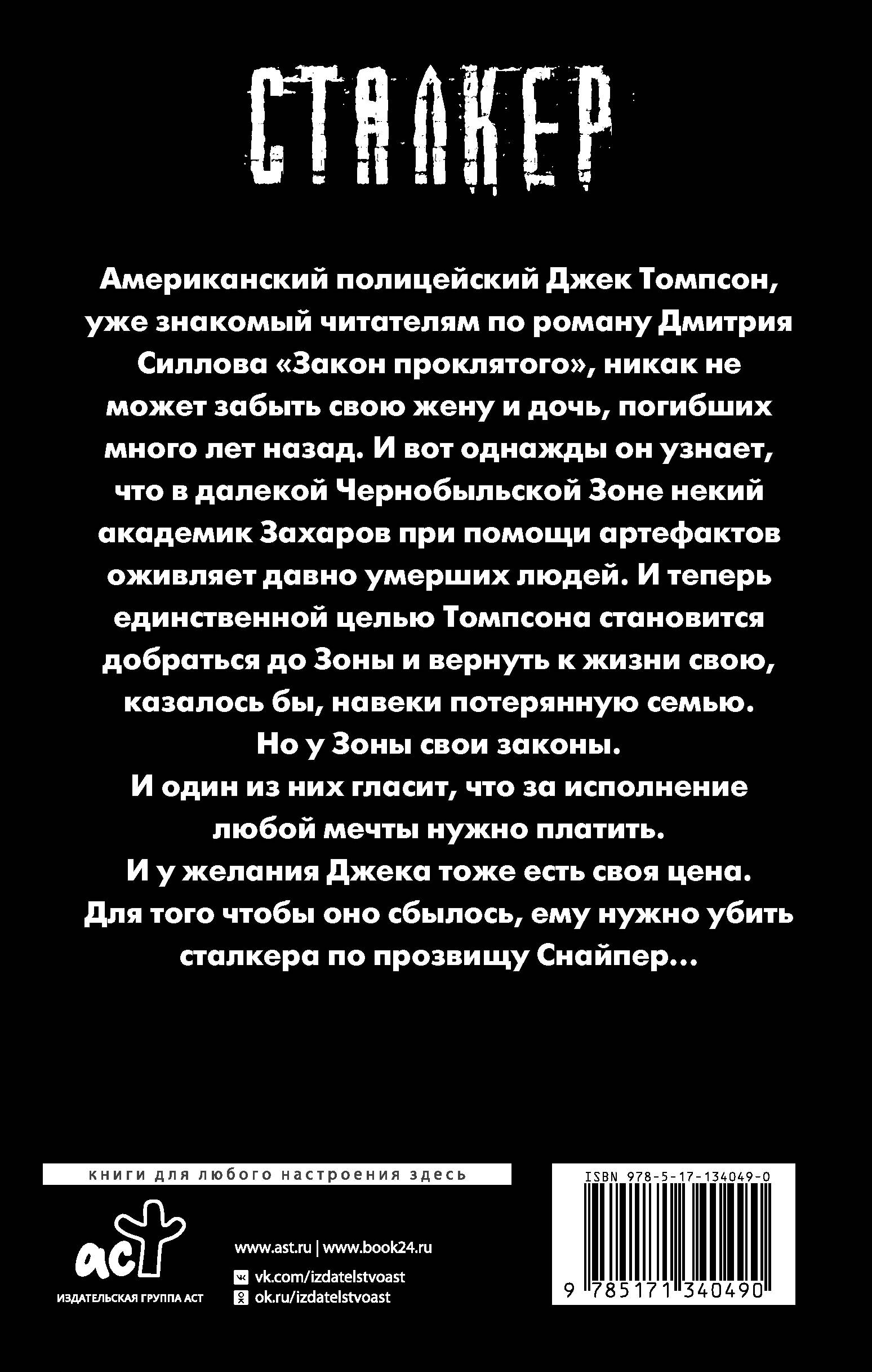 Американский полицейский Джек Томпсон, уже знакомый читателям по роману Дмитрия Силлова "Закон проклятого", никак не может забыть своих жену и дочь, погибших много лет назад. И вот однажды он узнает, что в далекой Чернобыльской Зоне некий академик Захаров при помощи артефактов оживляет давно умерших людей. И теперь единственной целью Томпсона становится добраться до Зоны и вернуть к жизни свою, казалось бы, навеки потерянную семью. Но у Зоны свои законы. И один из них гласит, что за исполнение любой мечты нужно платить. У желания Джека тоже есть своя цена. Для того чтобы оно сбылось, ему нужно убить сталкера по прозвищу Снайпер…| Издательство | ИЗДАТЕЛЬСТВО "АСТ" |