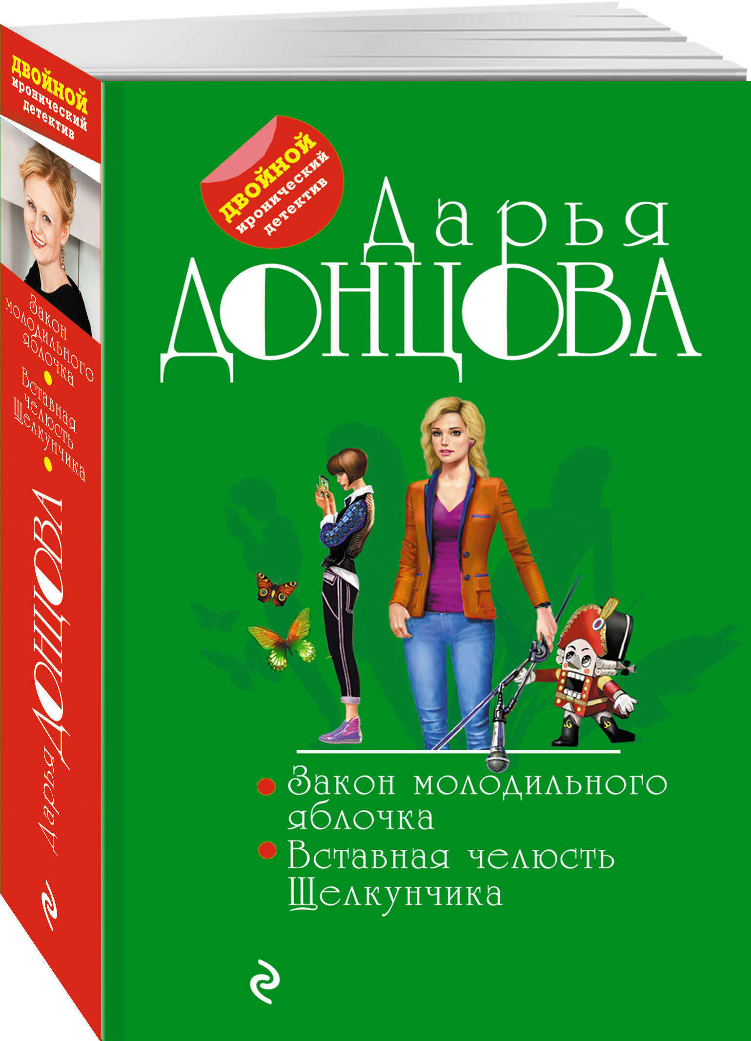 «Закон молодильного яблочка» Виола Тараканова собралась замуж за своего верного Степана! Пока жених в командировке, невеста опять вляпалась в историю. Прямо на глазах у Виолы в ресторане убивают мать олигарха Ферина, заказавшего писательнице создать книгу по его сюжету. Причем стреляет бывший одноклассник бизнесмена! С чего вдруг тихий историк-архивист взялся за пистолет?.. Конечно, чтобы разобраться в этой истории, Виола Тараканова полезет в гущу событий, а там обнаружится та-а-акое... Никаких «вдруг» не бывает, все в нашей жизни закономерно - действие равно противодействию. А если проще - как аукнется, так и откликнется. Сделал что-то дурное в юности, это дурное тебя через много лет настигнет… «Вставная челюсть Щелкунчика» Виола Тараканова - председатель жюри конкурса «Девочка года»! Ее издатель, который приветствует любой пиар автора Арины Виоловой, радостно потирал руки. Во время финала между тремя претендентками на Гран-при назревал конфликт. Вернее, его разжигали матери Марины и Сони и бабушка Алисы, Галина Сергеевна Петрова. Обе мамаши набросились на нее с обвинениями: Петрова поила внучку запрещенным средством для похудания. Галина Сергеевна, решив доказать, что в ее витаминном отваре нет ничего запрещенного, выпила его и... умерла. Мать Марины призналась: она подлила в отвар слабительное, чтобы избавиться от конкурентки дочери - Алисы. Но от слабительного не умирают! Разобраться в этой запутанной истории Виоле помогает новый приятель Степан Дмитриев. Однако Виоле все время кажется: она уже когда-то была с ним знакома… Дарья Донцова - самый популярный и востребованный автор в нашей стране, любимица миллионов читателей. В России продано более 200 миллионов экземпляров ее книг. Ее творчество наполняет сердца и души светом, оптимизмом, радостью, уверенностью в завтрашнем дне! -------------------------------------------------- «Донцова невероятная работяга! Я не знаю ни одного другого писателя, который столько работал бы. Я отношусь к ней с уважением, как к образцу писательского трудолюбия. Женщины нуждаются в психологической поддержке и получают ее от Донцовой. Я и сама в свое время прочла несколько романов Донцовой. Ее читают очень разные люди. И очень занятые бизнес-леди, чтобы на время выключить голову, и домохозяйки, у которых есть перерыв 15-20 минут между отвести-забрать детей». - Галина Юзефович, литературный критик| Издательство | Эксмо |
