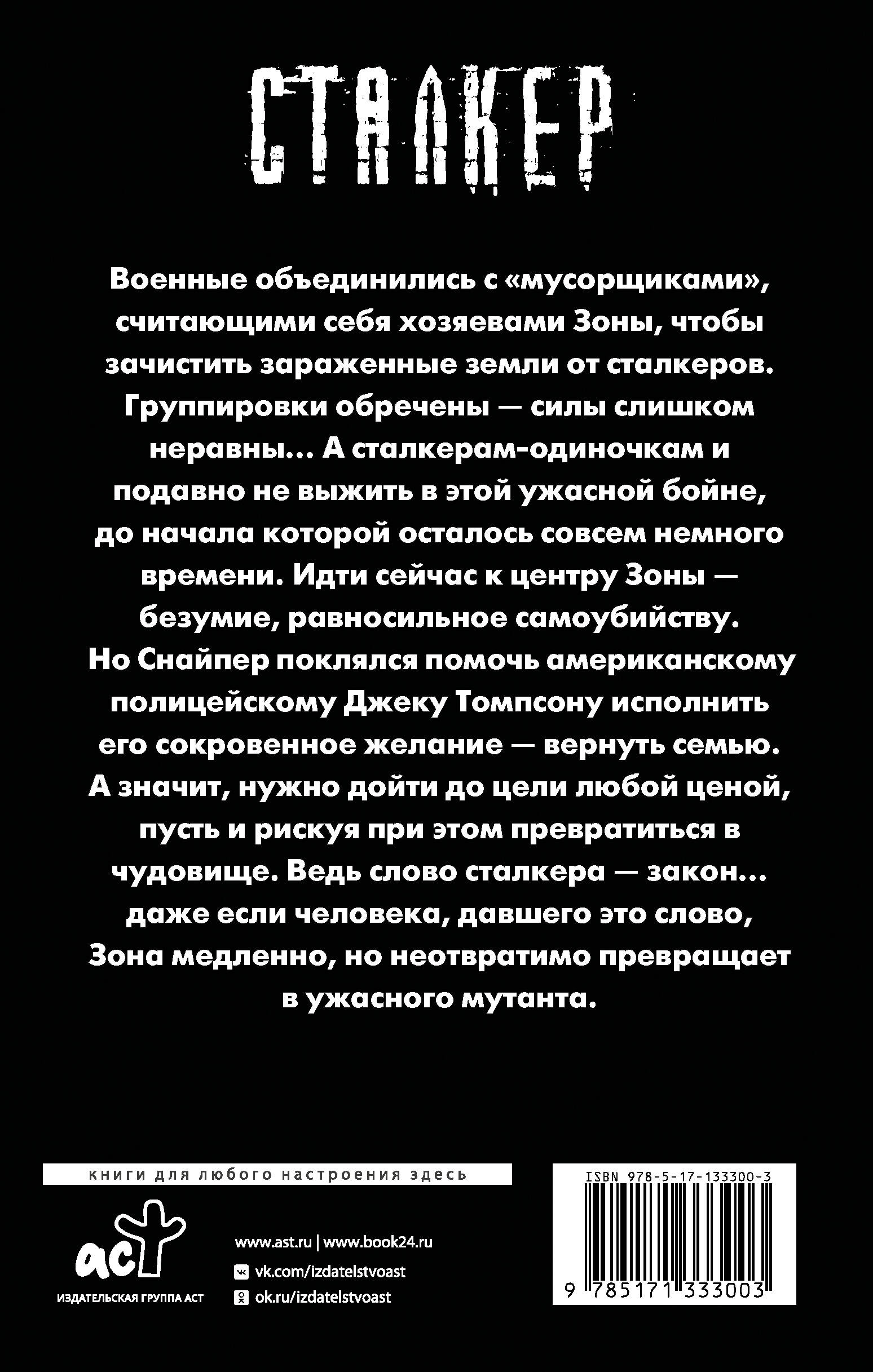 Военные объединились с "мусорщиками", считающими себя хозяевами Зоны, чтобы зачистить зараженные земли от сталкеров. Группировки обречены - силы слишком неравны… А сталкерам-одиночкам и подавно не выжить в этой ужасной бойне, до начала которой осталось совсем немного времени. Идти сейчас к центру Зоны - безумие, равносильное самоубийству. Но Снайпер поклялся помочь американскому полицейскому Джеку Томпсону исполнить его сокровенное желание - вернуть семью. А значит нужно дойти до цели любой ценой, даже рискуя при этом превратиться в чудовище. Ведь слово сталкера - закон… даже если человека, давшего это слово, Зона медленно, но неотвратимо превращает в ужасного мутанта.| Издательство | Издательство "АСТ" |