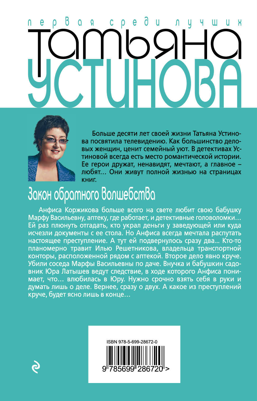 Анфиса Коржикова больше всего на свете любит свою бабушку Марфу Васильевну, аптеку, где работает, и детективные головоломки... Ей раз плюнуть отгадать, кто украл деньги у заведующей или куда исчезли документы с ее стола. Но Анфиса всегда мечтала распутать настоящее преступление. А тут ей подвернулось сразу два... Кто-то планомерно травит Илью Решетникова, владельца транспортной конторы, расположенной рядом с аптекой. Второе дело явно круче. Убили соседа Марфы Васильевны по даче. Внучка и бабушкин садовник Юра Латышев ведут следствие, в ходе которого Анфиса понимает, что... влюбилась в Юру. Нужно срочно взять себя в руки и думать лишь о деле. Вернее, сразу о двух. А какое из преступлений круче, будет ясно лишь в конце... Татьяна Устинова - один из топовых авторов современной российской прозы, обладатель двух премий «Электронная буква», лауреат «ТЭФИ» в номинации «Сценарист телевизионного фильма». «Первая среди лучших» - так называют Татьяну Витальевну, и это не просто остроумный эпитет, а звание, подтвержденное десятками написанных романов, успешными экранизациями и, конечно, любовью многочисленных поклонников ее творчества.| Издательство | ООО "Издательство "Эксмо" |