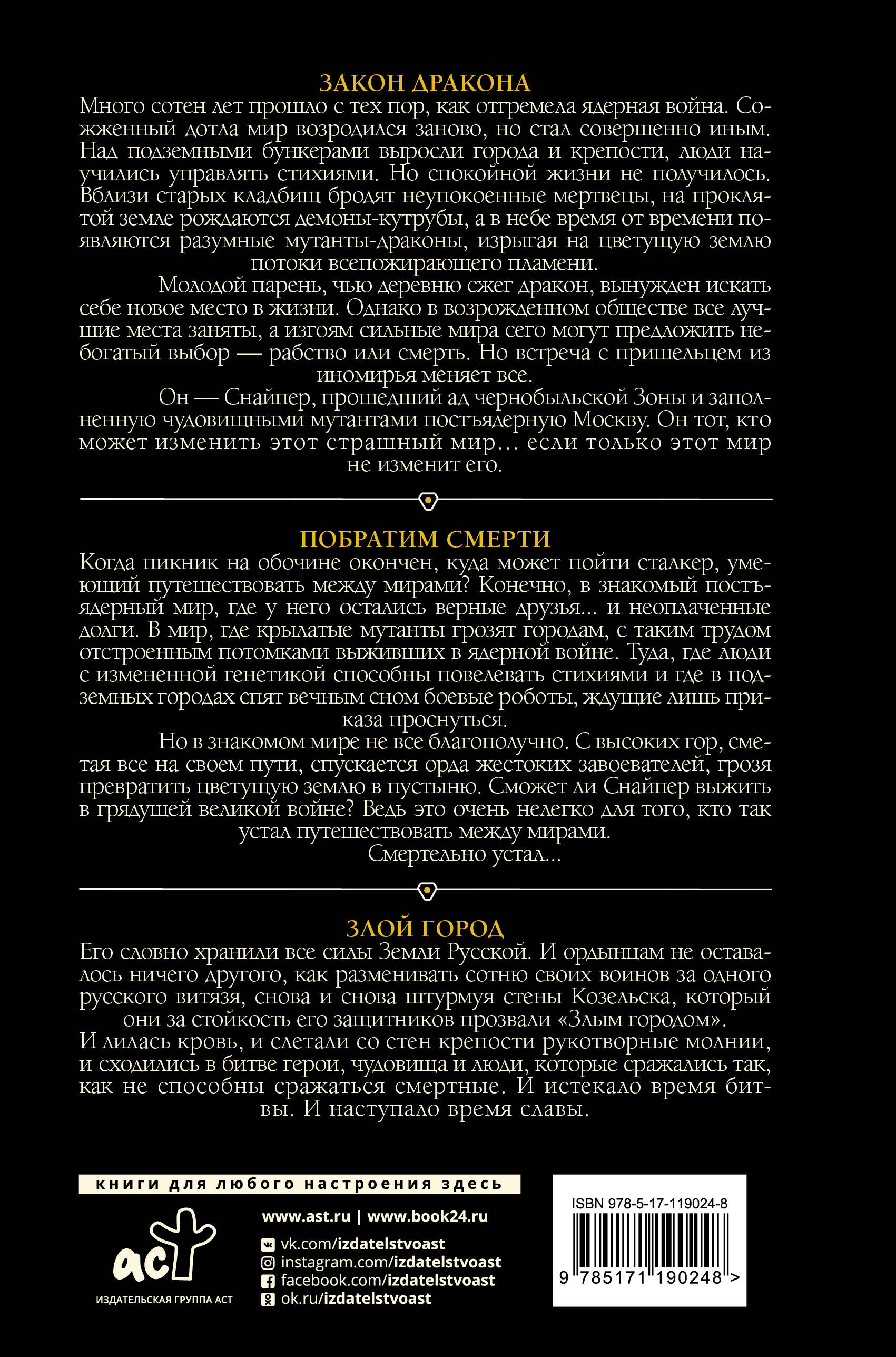 В настоящее издание вошли три романа Дмитрия Силлова: Закон дракона Много сотен лет прошло с тех пор, как отгремела ядерная война. Сожженный дотла мир возродился заново, но стал совершенно иным. Над подземными бункерами выросли города и крепости, люди научились управлять стихиями. Но спокойной жизни не получилось. Вблизи старых кладбищ бродят неупокоенные мертвецы, на проклятой земле рождаются демоны-кутрубы, а в небе время от времени появляются разумные мутанты-драконы, изрыгая на цветущую землю потоки всепожирающего пламени. Молодой парень, чью деревню сжег дракон, вынужден искать себе новое место в жизни. Однако в возрожденном обществе все лучшие места заняты, а изгоям сильные мира сего могут предложить небогатый выбор - рабство или смерть. Но встреча с пришельцем из иномирья меняет все. Он - Снайпер, прошедший ад чернобыльской Зоны и заполненную чудовищными мутантами постъядерную Москву. Он тот, кто может изменить этот страшный мир... если только этот мир не изменит его. Побратим смерти Когда пикник на обочине окончен, куда может пойти сталкер, умеющий путешествовать между мирами? Конечно, в знакомый постъядерный мир, где у него остались верные друзья... и неоплаченные долги. В мир, где крылатые мутанты грозят городам, с таким трудом отстроенным потомками выживших в ядерной войне. Туда, где люди с измененной генетикой способны повелевать стихиями и где в подземных городах спят вечным сном боевые роботы, ждущие лишь приказа проснуться. Но в знакомом мире не все благополучно. С высоких гор, сметая все на своем пути, спускается орда жестоких завоевателей, грозя превратить цветущую землю в пустыню. Сможет ли Снайпер выжить в грядущей великой войне? Ведь это очень нелегко для того, кто так устал путешествовать между мирами. Смертельно устал... Злой город Его словно хранили все силы Земли Русской. И ордынцам не оставалось ничего другого, как разменивать сотню своих воинов за одного русского витязя, снова и снова штурмуя стены Козельска, который они за стойкость его защитников прозвали "Злым городом". И лилась кровь, и слетали со стен крепости рукотворные молнии, и сходились в битве герои, чудовища и люди, которые сражались так, как не способны сражаться смертные. И истекало время битвы. И наступало время славы.| Издательство | АСТ |