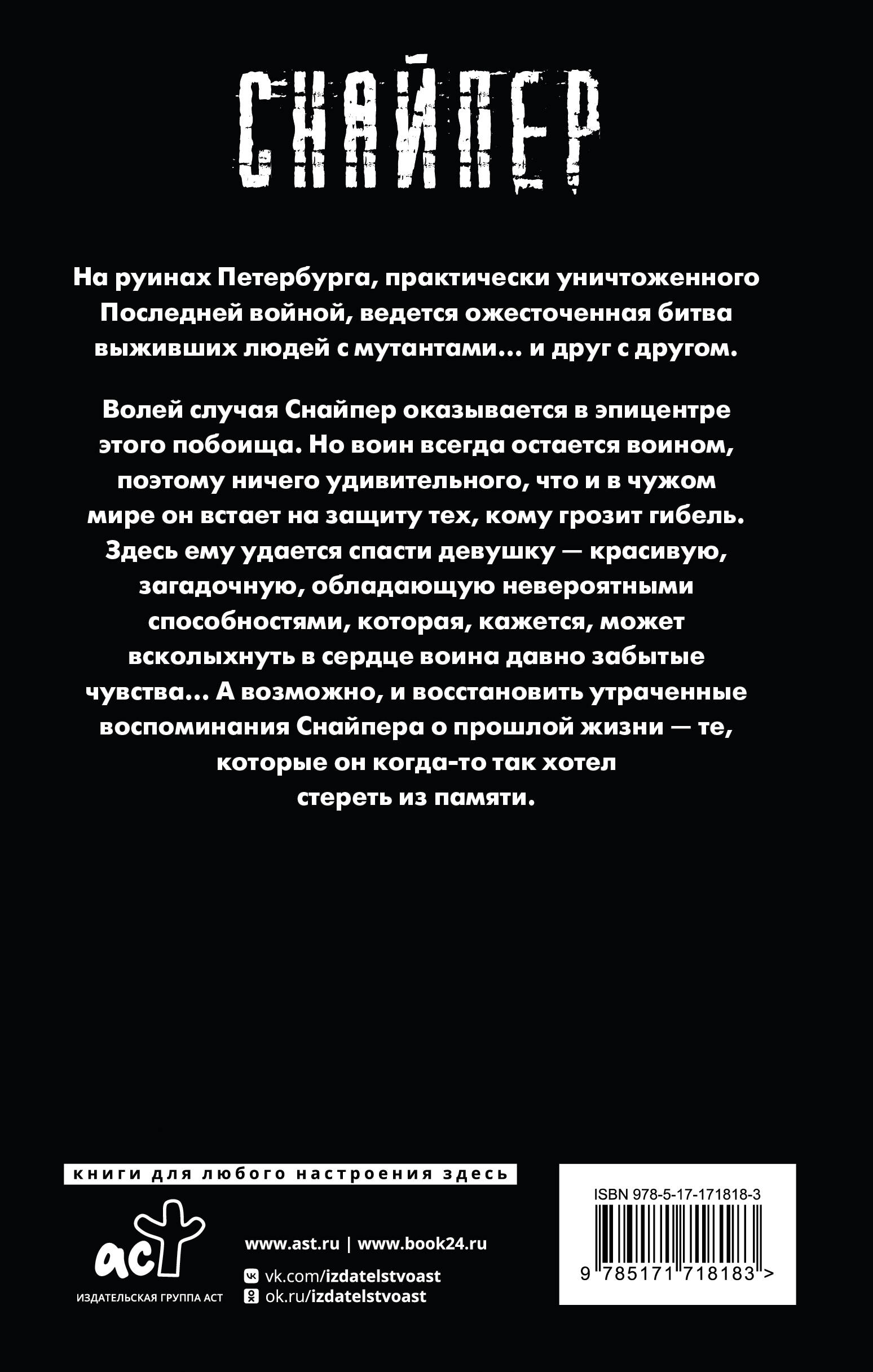- Переиздание историй о Снайпере, культовом персонаже серий "Сталкер" и «Кремль 2222», в обновленном оформлении. - Ранее роман издавался под названием «Кремль 2222. Петербург». - Боевая фантастика в постапокалиптическом мире, кишащем опасными тварями и раздираемом борьбой между людьми.