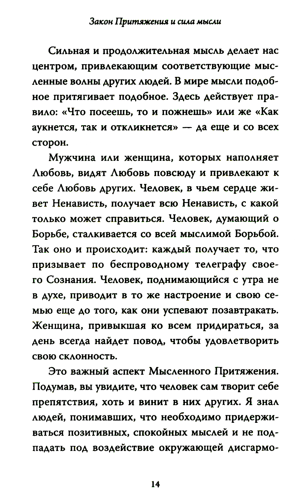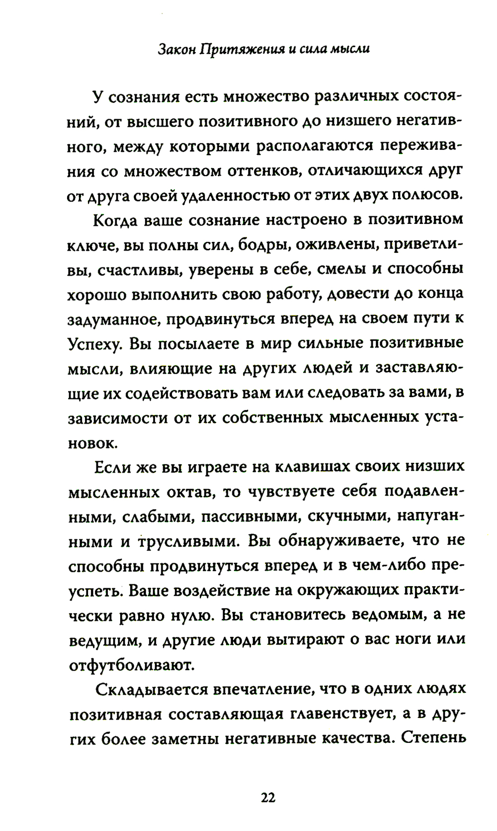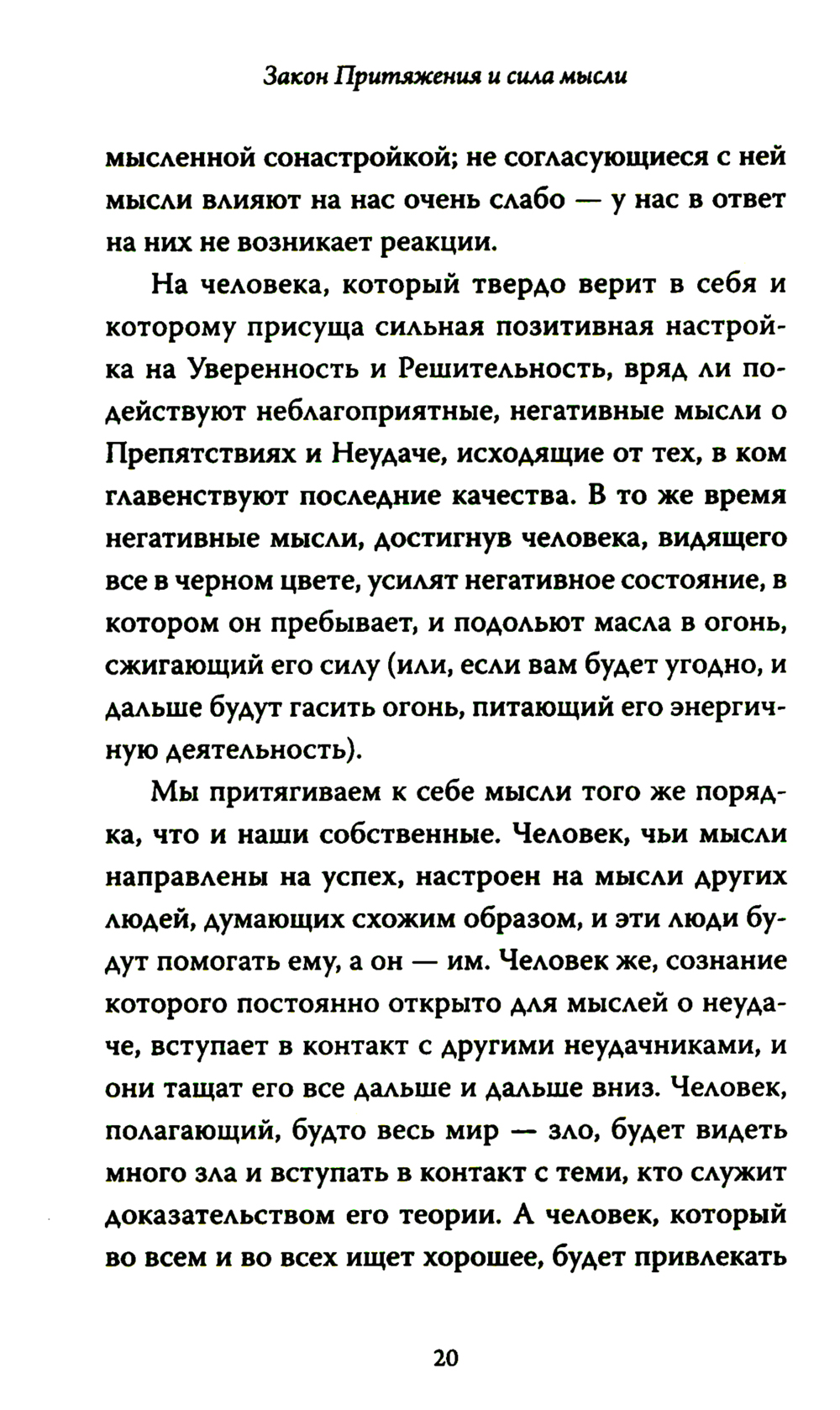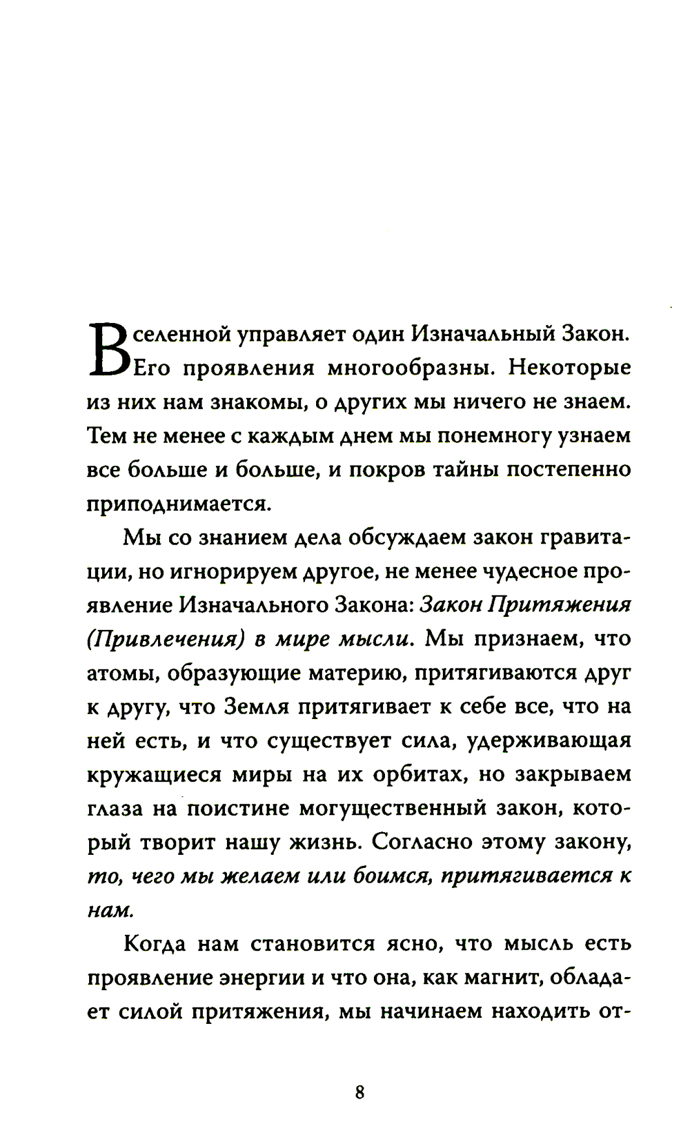 Нам хорошо известен закон гравитации, но мы нередко игнорируем другое проявление этого закона - Закон притяжения в мире мысли. Согласно этому закону то, него мы желаем или боимся, притягивается к нам. Когда нам становится ясно, что Мысль есть проявление энергии и что она, как магнит, обладает силой притяжения, мы начинаем находить ответы на вопросы «почему?» и «зачем?» касательно множества событий, которые раньше были нам непонятны. Ничто не вознаграждает человека столь щедро за его время и труд, как изучение принципов, по которым действует могущественный Закон притяжения в мире мысли.| Издательство | София |