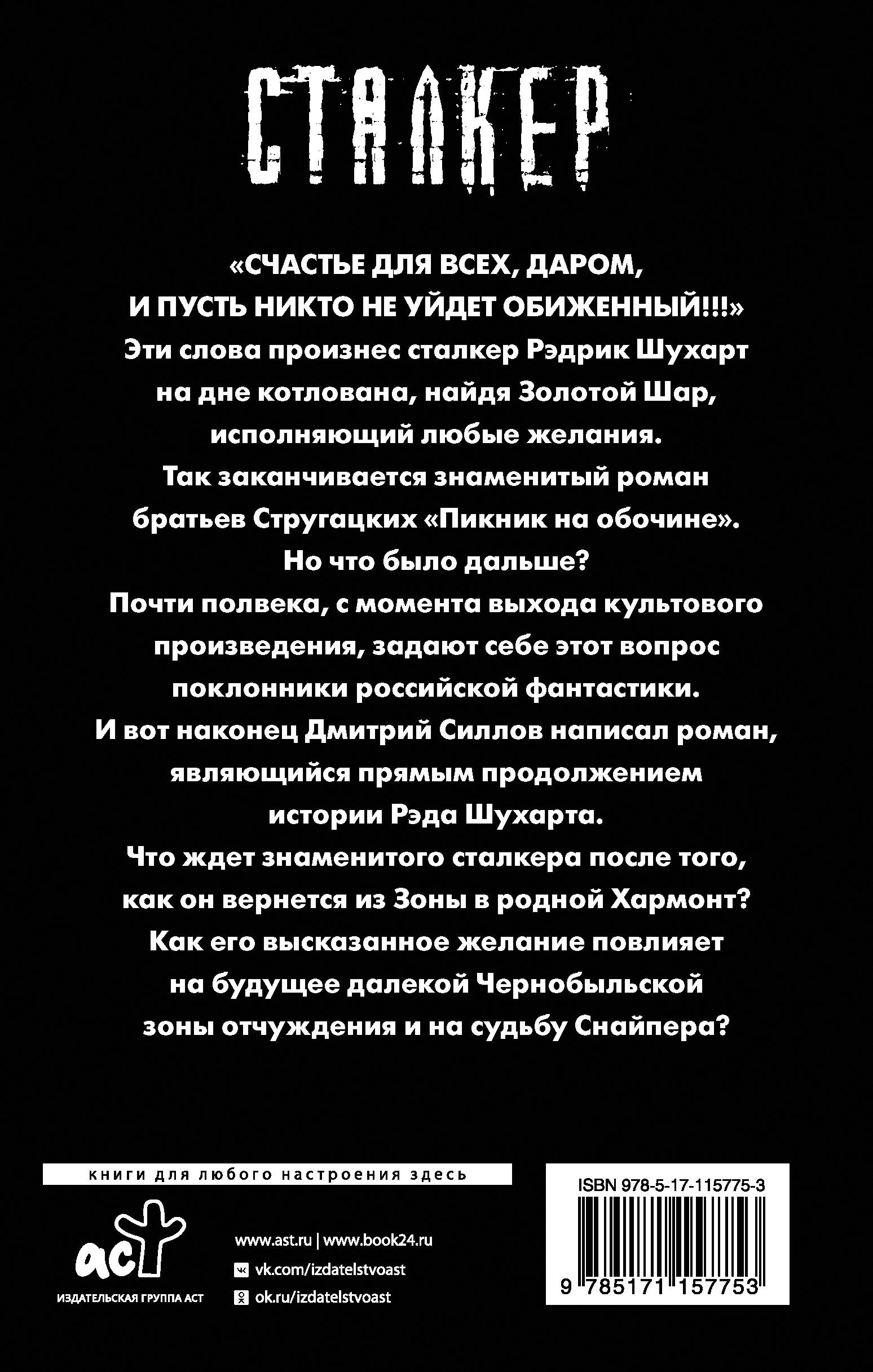 "СЧАСТЬЕ ДЛЯ ВСЕХ, ДАРОМ, И ПУСТЬ НИКТО НЕ УЙДЕТ ОБИЖЕННЫЙ!!!" Эти слова произнес сталкер Рэдрик Шухарт на дне котлована, найдя Золотой шар, исполняющий любые желания. Так заканчивается знаменитый роман братьев Стругацких "Пикник на обочине". Но что было дальше? Более сорока лет, с момента выхода культового произведения, задают себе этот вопрос поклонники российской фантастики. И вот наконец Дмитрий Силлов написал роман, являющийся прямым продолжением истории Рэда Шухарта. Что ждет знаменитого сталкера после того, как он вернется из Зоны в родной Хармонт? Как его высказанное желание повлияет на будущее далекой Чернобыльской зоны отчуждения и на судьбу Снайпера?| Издательство | Издательство "АСТ" |