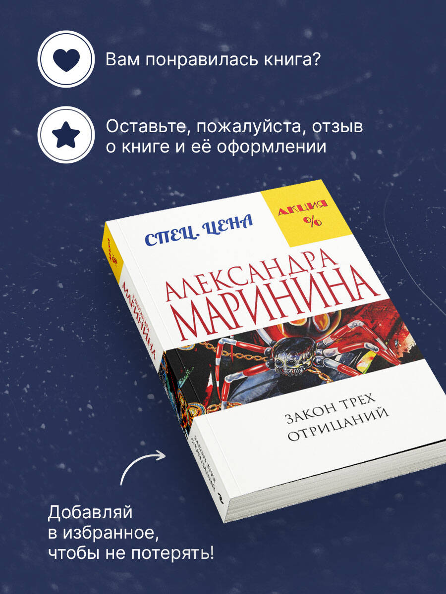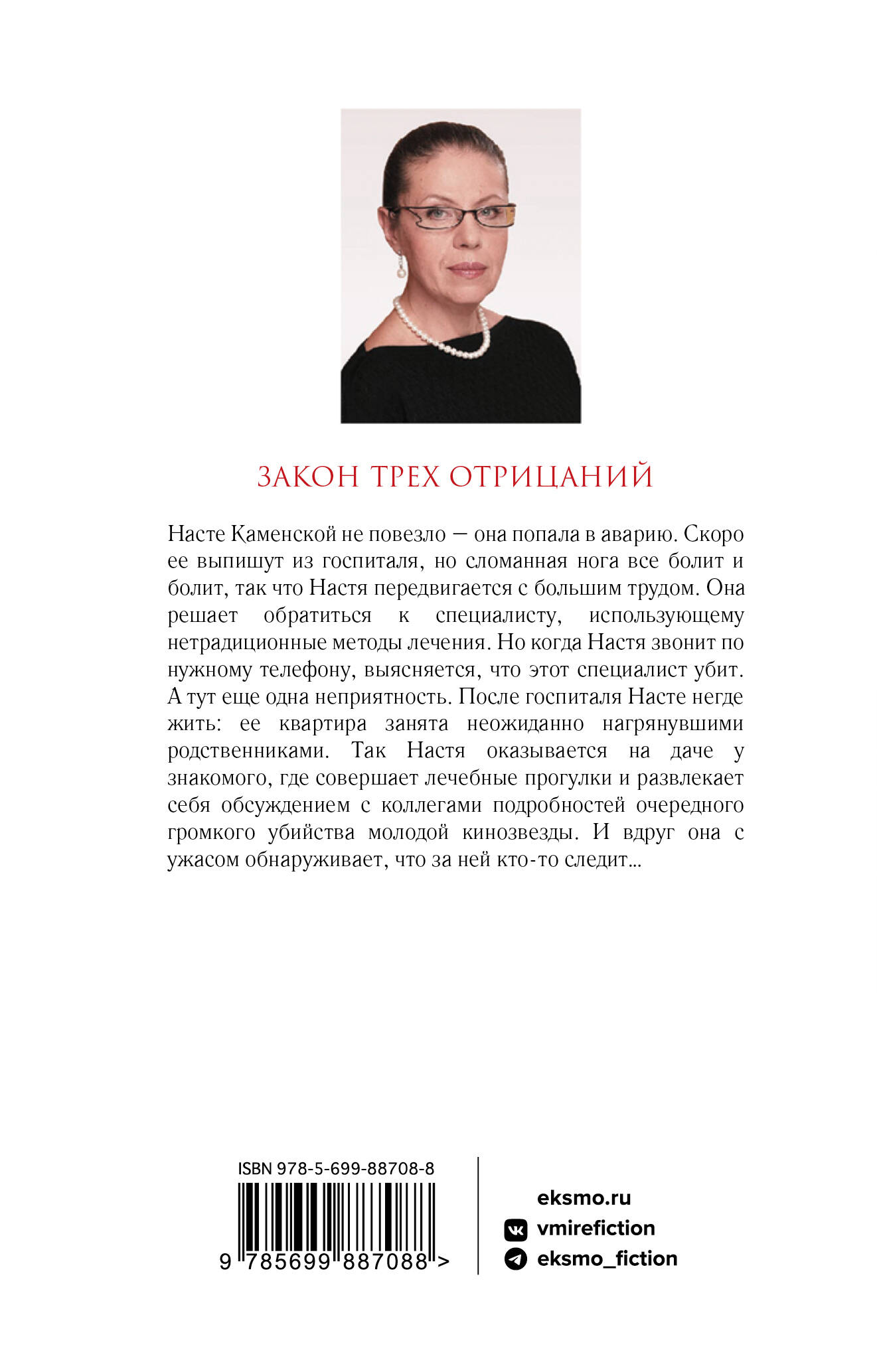 Насте Каменской не повезло - она попала в аварию. Скоро ее выпишут из госпиталя, но сломанная нога все болит и болит, так что Настя передвигается с большим трудом. Она решает обратиться к специалисту, использующему нетрадиционные методы лечения. Но когда Настя звонит по нужному телефону, выясняется, что этот специалист убит. А тут еще одна неприятность. После госпиталя Насте негде жить: ее квартира занята неожиданно нагрянувшими родственниками. Так Настя оказывается на даче у знакомого, где совершает лечебные прогулки и развлекает себя обсуждением с коллегами подробностей очередного громкого убийства молодой кинозвезды. И вдруг она с ужасом обнаруживает, что за ней кто-то следит… -------------------------------------------------- «Маринина не только пишет детективные романы, но и отвечает на вечные вопросы. Автор относится к своим читателям как добрый и опытный учитель к ученикам, которые нуждаются в поддержке, подсказке и направлении на верный путь. Оптимистичная и практичная в своей дидактике, Маринина ставит перед собой вопрос "как жить" и старается помочь читателю найти свой путь к лучшей жизни в сегодняшнем мире. Своими детективами Маринина пишет современный роман "воспитания чувств": основная цель автора - воспитание посредством развлечения». - Анатолий Вишевский, Гринелльский колледж, США «Многие романы Александры Марининой в России экранизированы, а в Германии переработаны в радиопьесы. Исходя из того, что цель этих обработок - захватывать зрителей и слушателей таким же образом, как захвачены читатели, то фильм и радиопьеса являются не только дополнительными художественными произведениями, но и интересными интерпретациями, которые проникли в тайну успеха Александры Марининой». - Сара Хэги, Кельнский университет, Германия «В диалогах художественной и тривиальной литературы можно обнаружить разные способы стилизации "устности", чтобы достичь впечатления спонтанного разговора. Обиходная речь в романах А. Марининой отличается необыкновенно высокой степенью оживленности, что выражается, между прочим, в разных формах обращения собеседников, в различных оттенках вежливости и в эмоциональности используемой лексики». - Вольфганг Штадлер, Университет имени Леопольда Францена, Инсбрук, Австрия| Издательство | ООО "Издательство "Эксмо" |