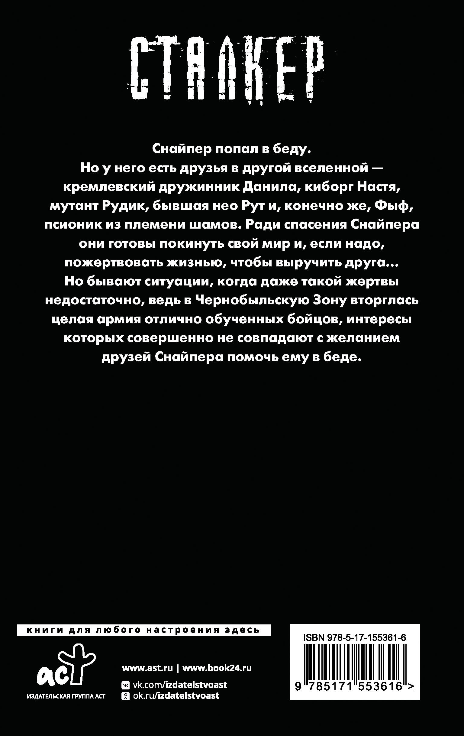 Снайпер попал в беду. Но у него есть друзья в другой вселенной - кремлевский дружинник Данила, киборг Настя, мутант Рудик, бывшая нео Рут и, конечно же, Фыф, псионик из племени шамов. Ради спасения Снайпера они готовы покинуть свой мир и, если надо, пожертвовать жизнью, чтобы выручить друга… Но бывают ситуации, когда даже такой жертвы недостаточно, ведь в Чернобыльскую Зону вторглась целая армия отлично обученных бойцов, интересы которых совершенно не совпадают с желанием друзей Снайпера помочь ему в беде.| Издательство | Издательство "АСТ" |