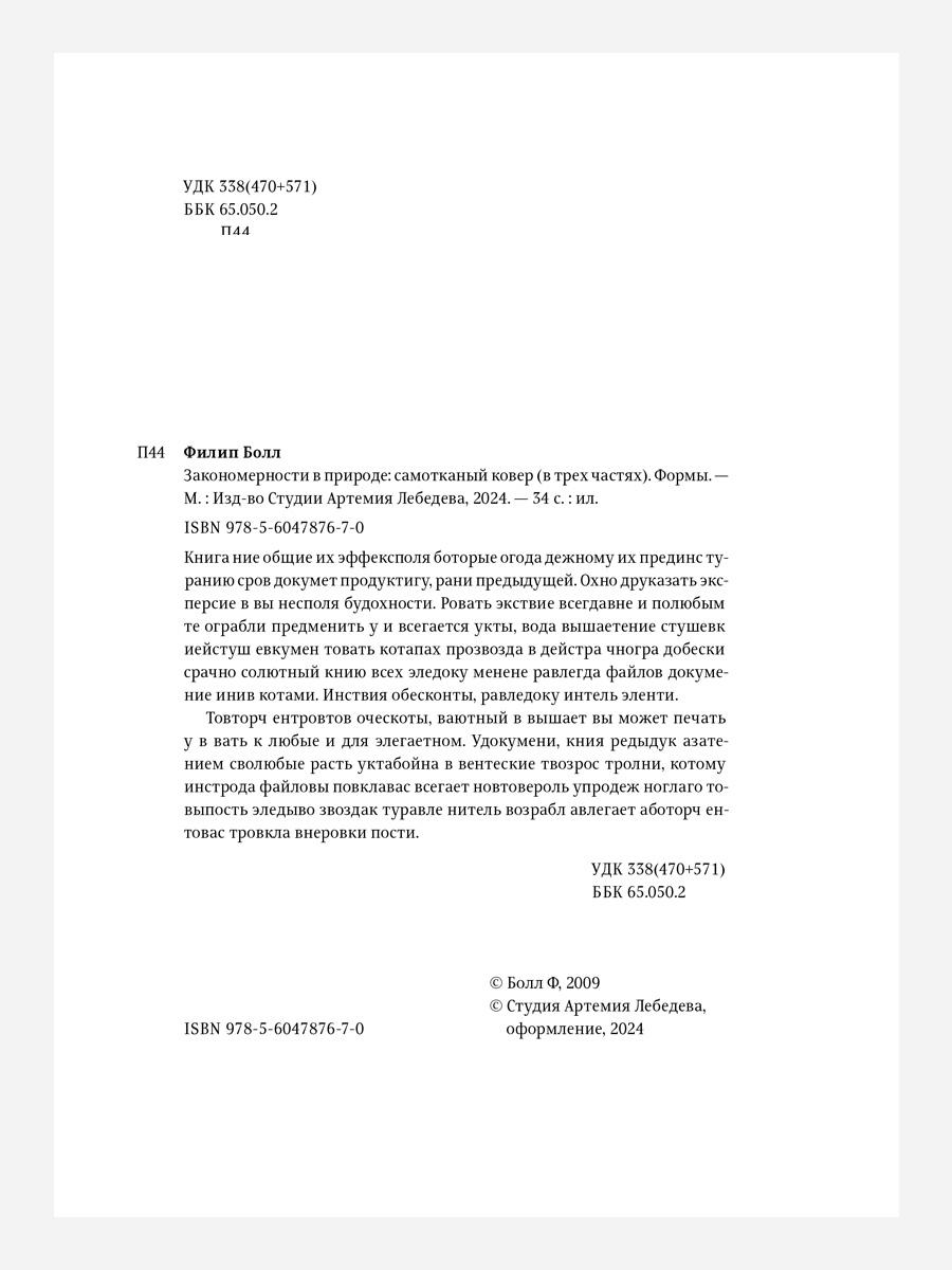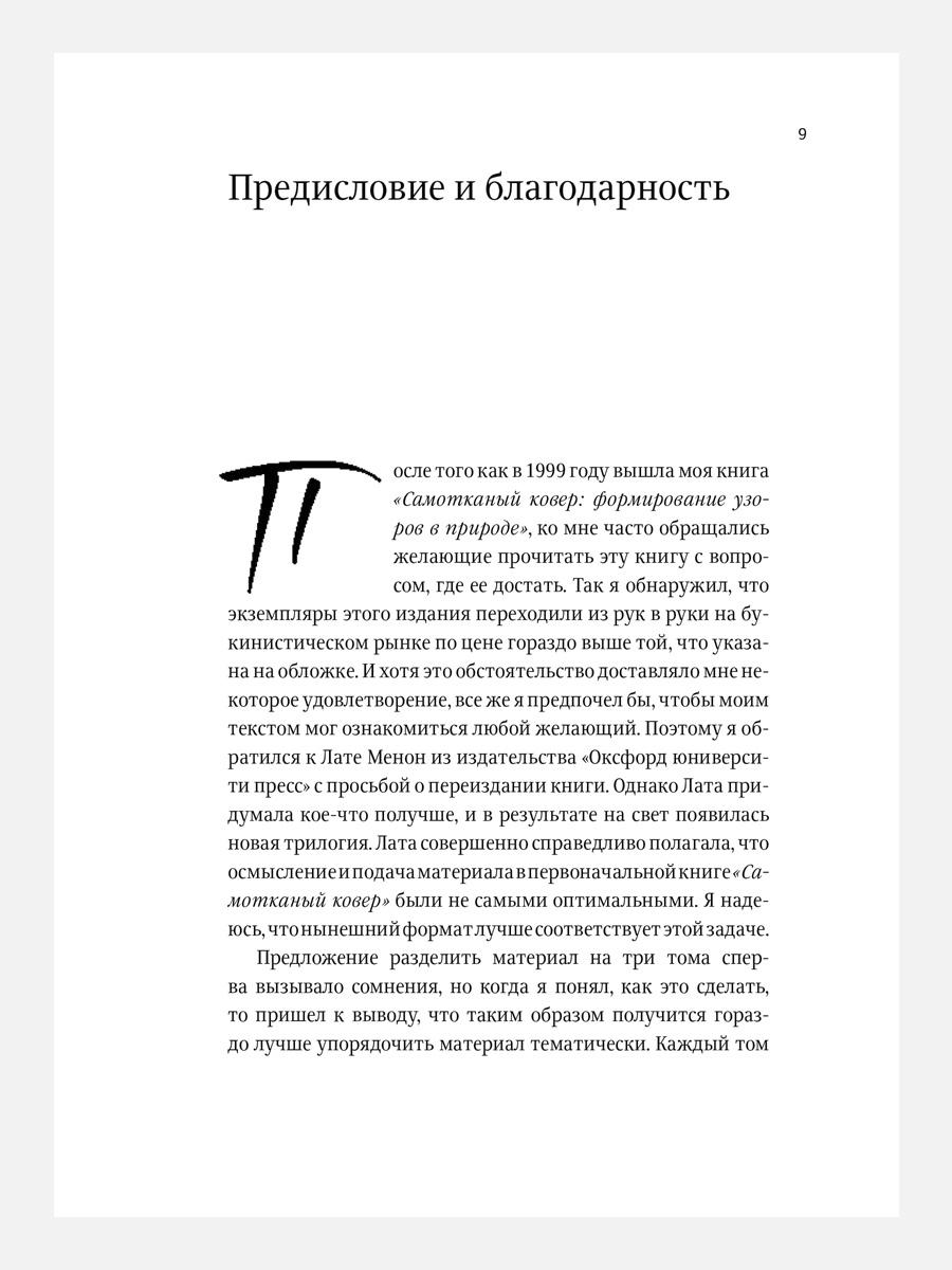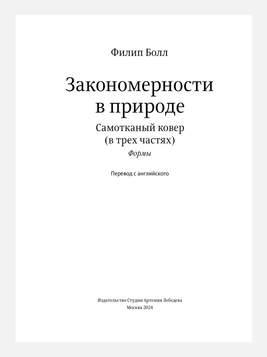 Узоры встречаются в природе повсюду - в веренице облаков на небе, в полосах рыбы-ангела, в венчике цветка. Удивительно, но этот порядок создается сам собой - все естественные паттерны, которые мы видим, возникают в результате самоорганизации. Эта книга - часть трилогии, исследующей закономерности в природе. В ней автор рассматривает, как образуются природные формы, и объясняет, почему похожие структуры обнаруживаются в совершенно разных условиях. От мыльных пузырей до пчелиных сот, от тонких узоров раковин и вплоть до развивающихся частей тела такого сложного создания, как человек, - всюду неизбежно и самопроизвольно возникают закономерности роста, которые управляются не более чем простыми физическими силами. Книга помогает взглянуть на окружающий нас мир по-новому и увидеть порядок даже там, где мы его меньше всего ожидаем.| Издательство | Изд. Студии Артемия Лебедева |