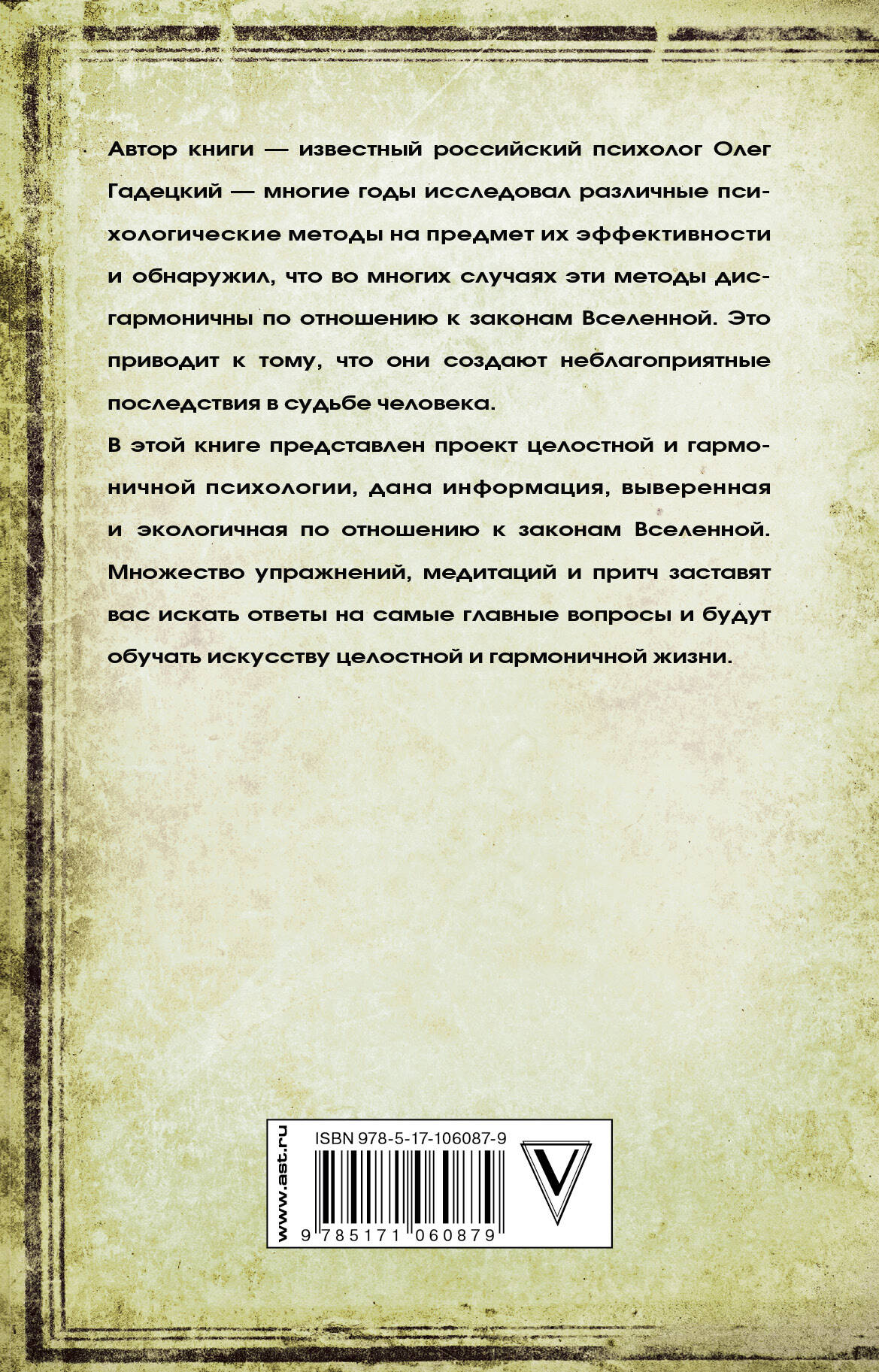 Автор книги - известный российский психолог Олег Гадецкий - многие годы исследовал различные психологические методы на предмет их эффективности и обнаружил, что во многих случаях эти методы дисгармоничны по отношению к законам Вселенной. Это приводит к тому, что они создают неблагоприятные последствия в судьбе человека. В этой книге представлен проект целостной и гармоничной психологии, дана информация, выверенная и экологичная по отношению к законам Вселенной. Множество упражнений, медитаций и притч заставят вас искать ответы на самые главные вопросы и будут обучать искусству целостной и гармоничной жизни.
