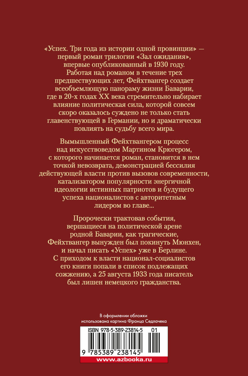 "Успех. Три года из истории одной провинции" - первый роман трилогии "Зал ожидания", впервые опубликованный в 1930 году. Работая над романом в течение трех предшествующих лет, Фейхтвангер создает всеобъемлющую панораму жизни Баварии, где в 20-х годах XX века стремительно набирает влияние политическая сила, которой совсем скоро оказалось суждено не только стать главенствующей в Германии, но и драматически повлиять на судьбу всего мира. Вымышленный Фейхтвангером процесс над искусствоведом Мартином Крюгером, с которого начинается роман, становится в нем точкой невозврата, демонстрацией бессилия действующей власти против вызовов современности, катализатором популярности энергичной идеологии истинных патриотов и будущего успеха националистов с авторитетным лидером во главе... Пророчески трактовав события, вершащиеся на политической арене родной Баварии, как трагические, Фейхтвангер вынужден был покинуть Мюнхен и начал писать "Успех" уже в Берлине. С приходом к власти национал-социалистов его книги попали в список подлежащих сожжению, а 25 августа 1933 года писатель был лишен немецкого гражданства.
