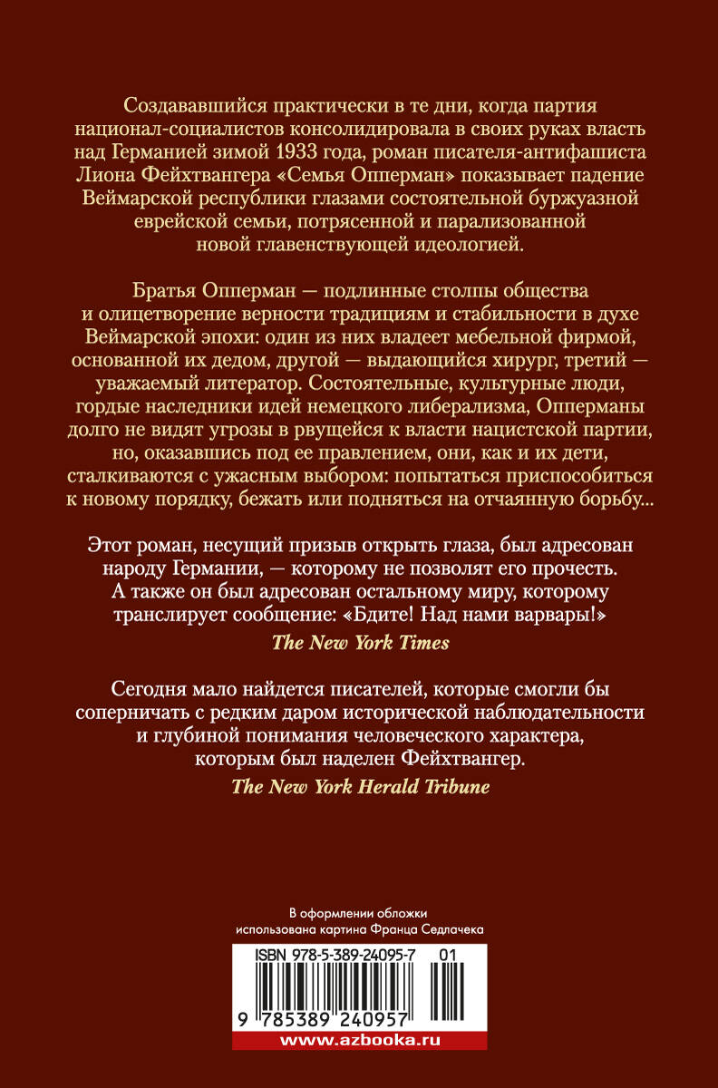 Создававшийся практически в те дни, когда партия национал-социалистов консолидировала в своих руках власть над Германией зимой 1933 года, роман писателя-антифашиста Лиона Фейхтвангера "Семья Опперман" показывает падение Веймарской республики глазами состоятельной буржуазной еврейской семьи, потрясенной и парализованной новой главенствующей идеологией. Братья Опперман - подлинные столпы общества и олицетворение верности традициям и стабильности в духе Веймарской эпохи: один из них владеет мебельной фирмой, основанной их дедом, другой - выдающийся хирург, третий - уважаемый литератор. Состоятельные, культурные люди, гордые наследники идей немецкого либерализма, Опперманы долго не видят угрозы в рвущейся к власти нацистской партии, но, оказавшись под ее правлением, они, как и их дети, сталкиваются с ужасным выбором: попытаться приспособиться к новому порядку, бежать или подняться на отчаянную борьбу...| Издательство | Азбука-Аттикус Издат.группа ООО |