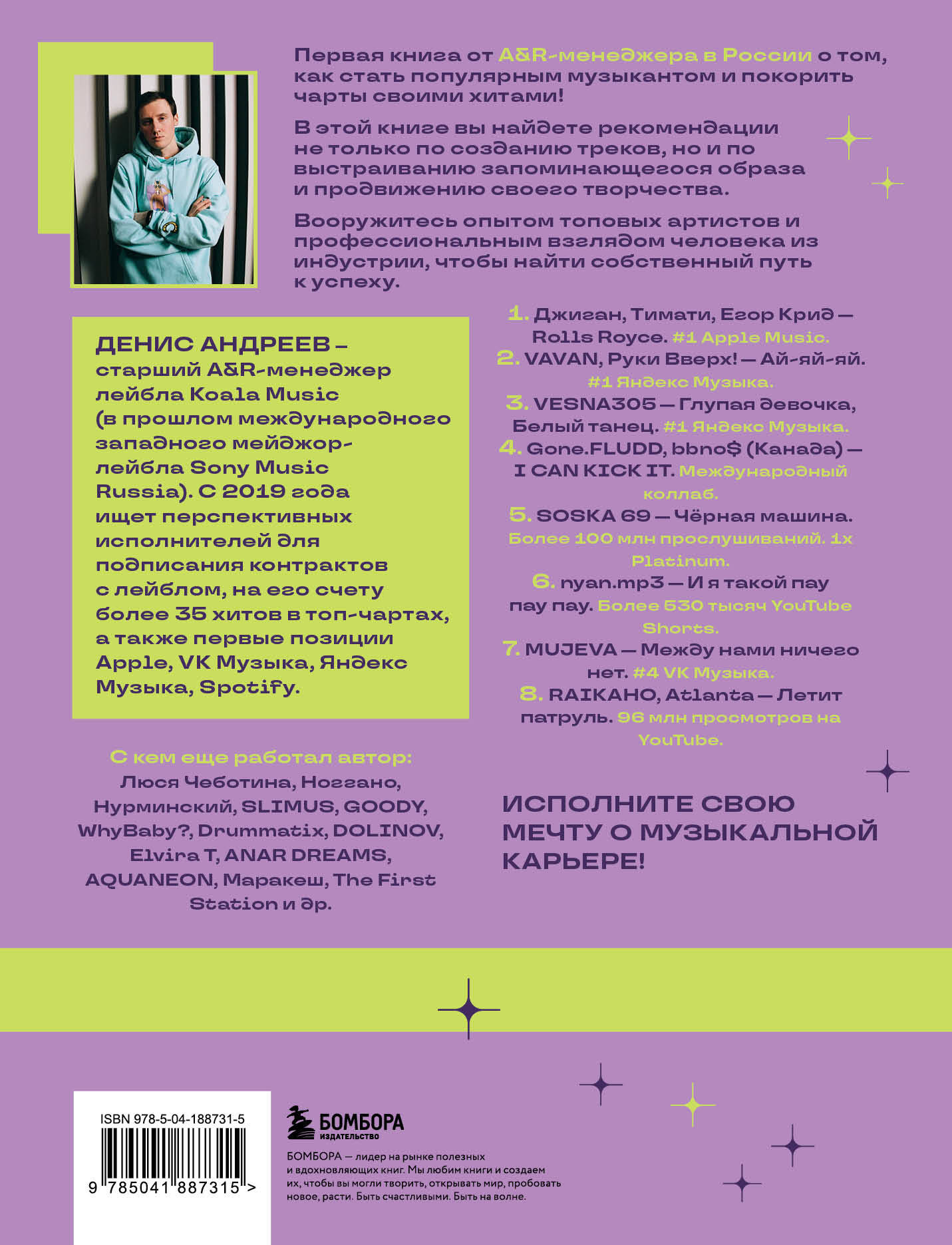 Первая книга от A&R менеджера в России о том, как стать популярным музыкантом и покорить чарты своими хитами! Денис Андреев - старший A&R менеджер лейбла Koala Music и автор этой книги, с 2020 года он занимается поиском будущих звезд и знает, как понять, выстрелит ли песня. Книга «Залететь в чарты: инструкция к успеху» поможет вам оценить собственное творчество, системно подойти к созданию треков и сделать их более цепляющими. Расскажет, как создать запоминающийся образ и какие методы продвижения в соцсетях наиболее удачные. И, конечно, это уникальный контент от эксперта индустрии, помноженный на опыт уже состоявшихся артистов и успешных фрешменов. «Я бы хотел прочитать нечто подобное, если бы начинал сегодня путь артиста. Простые вещи, зачастую лежащие на поверхности, распознать тяжелее всего. Когда я стал заниматься музыкой, такой книги не было, но теперь у вас есть настоящий музыкальный путеводитель». Книга удачно сочетает теорию и практические задания, содержит множество разборов и интерактивного материала, а сама информация подана без воды и понятным языком. Она подойдет как совсем новичкам, так и тем, кто уже начал профессиональный путь в музыке, но еще в поисках своей аудитории и популярности. Денис Андреев (@denisandreev_music) - старший A&R менеджер лейбла Koala Music (в прошлом международного западного мейджор лейбла Sony Music Russia). С 2020 года на его счету более 35 хитов в топ-чартах, а также первые позиции Apple, VK Music, Яндекс Музыка, Spotify и т.д. Треки и исполнители, с которыми работал Денис: 1. Джиган, Тимати, Егор Крид - Rolls Royce. #1 Apple Music. 2. VAVAN, «Руки Вверх!» - Ай-яй-яй. #1 Яндекс Музыка. 3. VESNA305 - «Глупая девочка», «Белый танец». #1 Яндекс Музыка. 4. Gone.FLUDD, bbno$ (Канада) - I CAN KICK IT. Международный коллаб. 5. SOSKA 69 - «Чёрная машина». Более 100 млн прослушиваний. 1x Platinum. 6. nyan.mp3 - «И я такой пау пау пау». Более 530 тысяч YouTube Shorts. 7. MUJEVA - «Между нами ничего нет». #4 VK Музыка 8. RAIKAHO, Atlanta - «Летит патруль». 96 млн просмотров на YouTube. А также: Люся Чеботина, Ноггано, Нурминский, SLIMUS, GOODY, WhyBaby?, Drummatix, DOLINOV, Elvira T, ANAR DREAMS, AQUANEON, Маракеш, The First Station и другие. И другие исполнители, чьи песни наверняка есть и в вашем плейлисте. Станьте одним из них и исполните свою мечту!| Издательство | ООО "Издательство "Эксмо" |