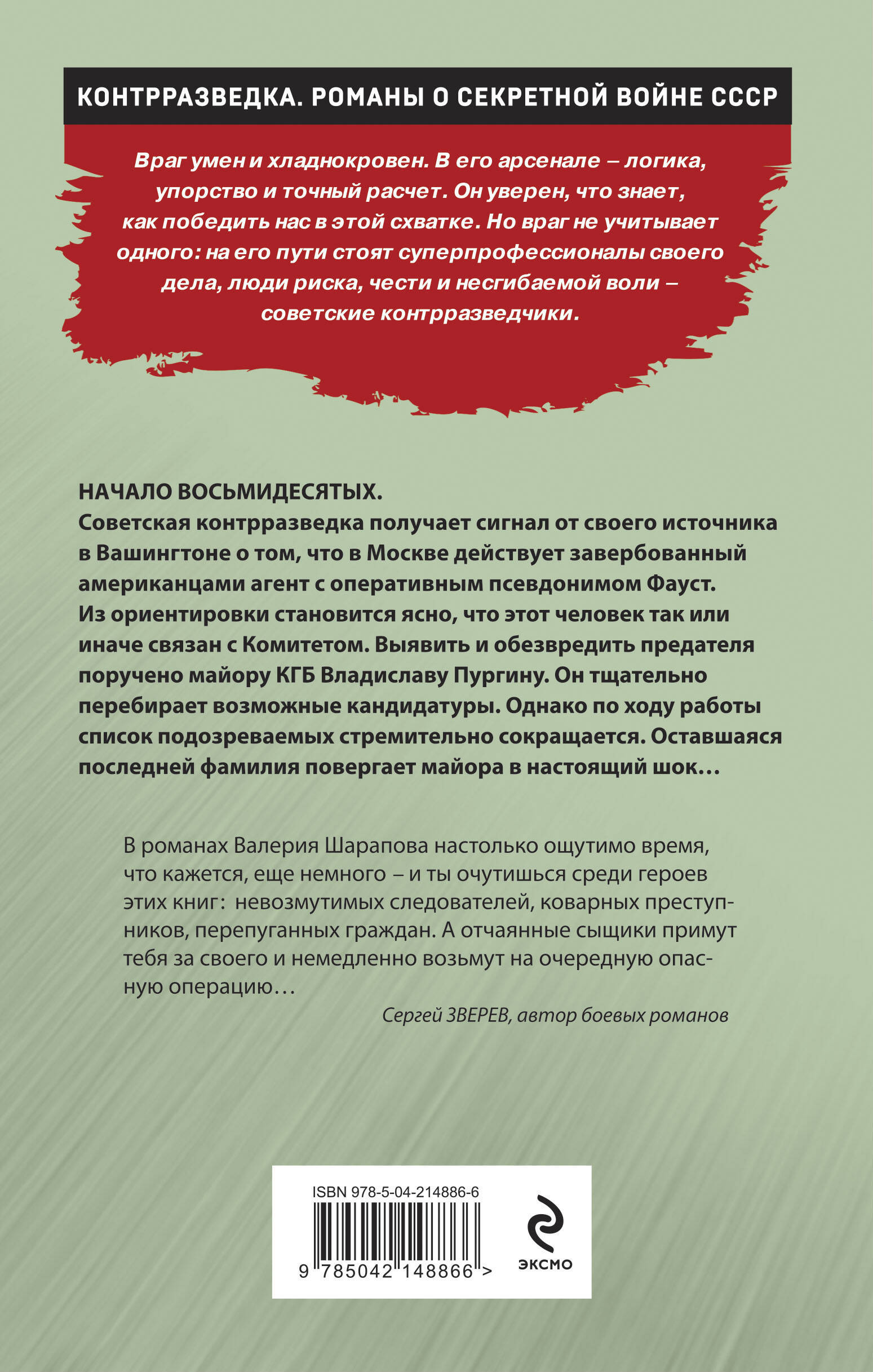 Начало восьмидесятых. Советская контрразведка получает сигнал от своего источника в Вашингтоне о том, что в Москве действует завербованный американцами агент с оперативным псевдонимом Фауст. Из ориентировки становится ясно, что этот человек так или иначе связан с Комитетом. Выявить и обезвредить предателя поручено майору КГБ Владиславу Пургину. Он тщательно перебирает возможные кандидатуры. Однако по ходу работы список подозреваемых стремительно сокращается. Оставшаяся последней фамилия повергает майора в настоящий шок… Враг умен и хладнокровен. В его арсенале - логика, упорство и точный расчет. Он уверен, что знает, как победить нас в этой схватке. Но враг не учитывает одного: на его пути стоят суперпрофессионалы своего дела, люди риска, чести и несгибаемой воли - советские контрразведчики. «В романах Валерия Шарапова настолько ощутимо время, что кажется, еще немного, и ты очутишься среди героев этих книг - невозмутимых следователей, коварных преступников, перепуганных граждан. А отчаянные сыщики примут тебя за своего и немедленно возьмут на очередную опасную операцию…» - Сергей ЗВЕРЕВ, автор боевых романов| Издательство | ООО "Издательство "Эксмо" |