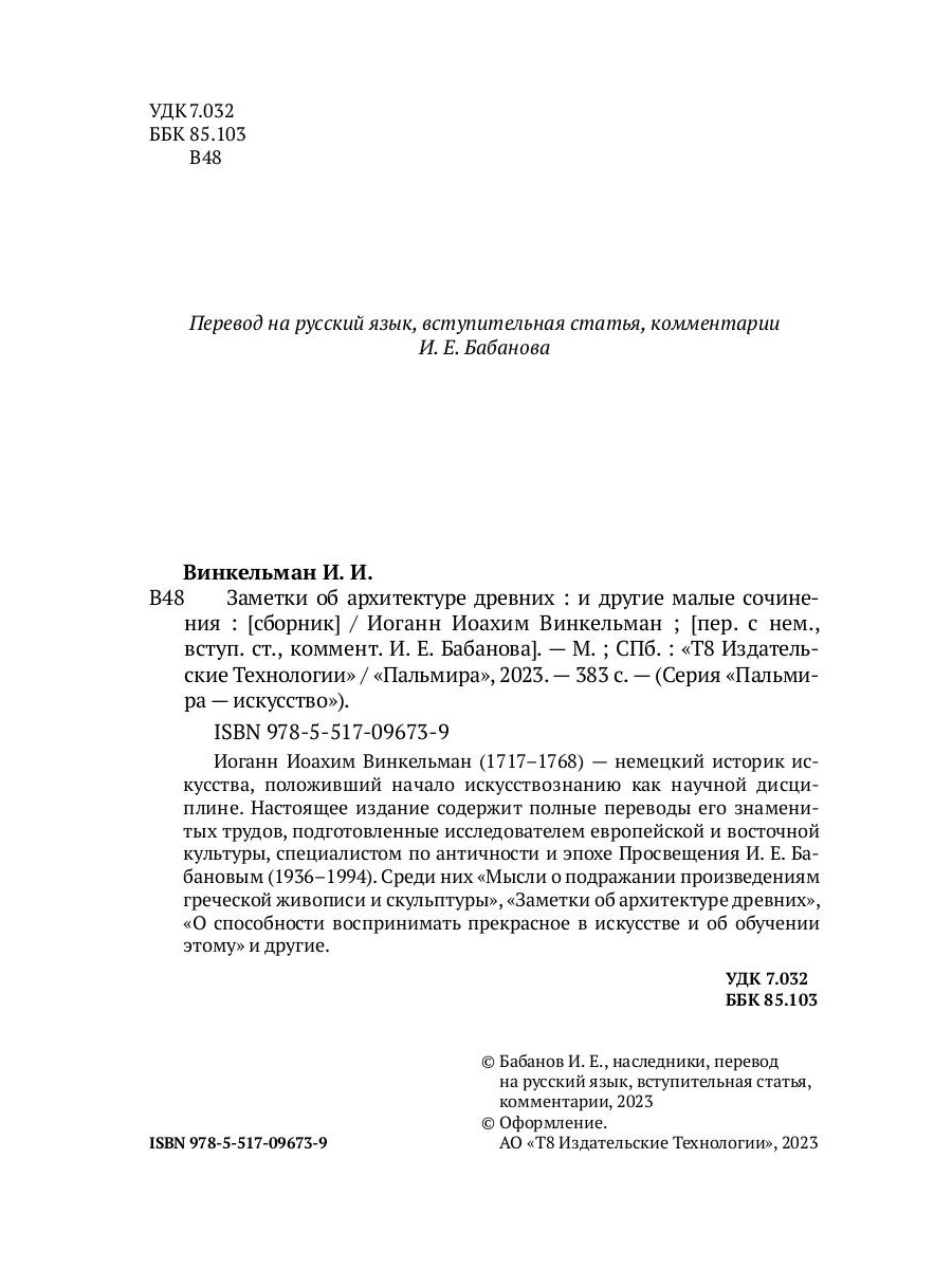 Иоганн Иоахим Винкельман (1717-1768) - немецкий историк искусства, положивший начало искусствознанию как научной дисциплине. Настоящее издание содержит полные переводы его знаменитых трудов, подготовленные исследователем европейской и восточной культуры, специалистом по античности и эпохе Просвещения И. Е. Бабановым (1936-1994). Среди них "Мысли о подражании произведениям греческой живописи и скульптуры", "Заметки об архитектуре древних", "О способности воспринимать прекрасное в искусстве и об обучении этому" и другие.