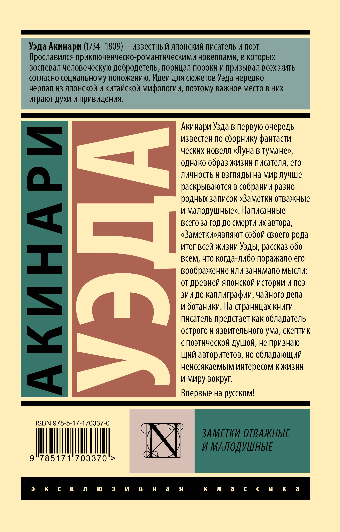 Акинари Уэда в первую очередь известен по сборнику фантастических новелл "Луна в тумане", однако образ жизни писателя, его личность и взгляды на мир лучше раскрываются в собрании разнородных записок "Заметки отважные и малодушные". Написанные всего за год до смерти их автора, "Заметки" являют собой своего рода итог всей жизни Уэды, рассказ обо всем, что когда-либо поражало его воображение или занимало мысли: от древней японской истории и поэзии до каллиграфии, чайного дела и ботаники. На страницах книги писатель предстает как обладатель острого и язвительного ума, скептик с поэтической душой, не признающий авторитетов, но обладающий неиссякаемым интересом к жизни и миру вокруг. Впервые на русском!| Издательство | Издательство "АСТ" |