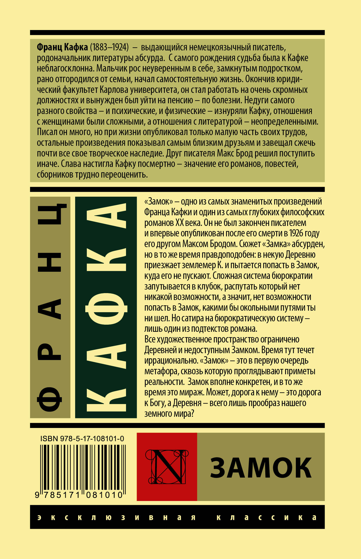 "Замок" - одно из самых знаменитых произведений Франца Кафки и один из самых глубоких философских романов ХХ века. Он был не закончен писателем и впервые опубликован после его смерти в 1926 году его другом Максом Бродом. Сюжет "Замка" абсурден, но в то же время правдоподобен: в некую Деревню приезжает землемер К. и пытается попасть в Замок, куда его не пускают. Сложная система бюрократии запутывается в клубок, распутать который нет никакой возможности, а значит, нет возможности попасть в Замок, какими бы окольными путями ты ни шел. Но сатира на бюрократическую систему - лишь один из подтекстов романа. Все художественное пространство ограничено Деревней и недоступным Замком. Время тут течет иррационально. "Замок" - это в первую очередь метафора, сквозь которую проглядывают приметы реальности. Замок - вполне конкретен, и в то же время это мираж. Может, дорога к нему - это дорога к Богу, а Деревня - всего лишь прообраз нашего земного мира?| Издательство | ИЗДАТЕЛЬСТВО "АСТ" |