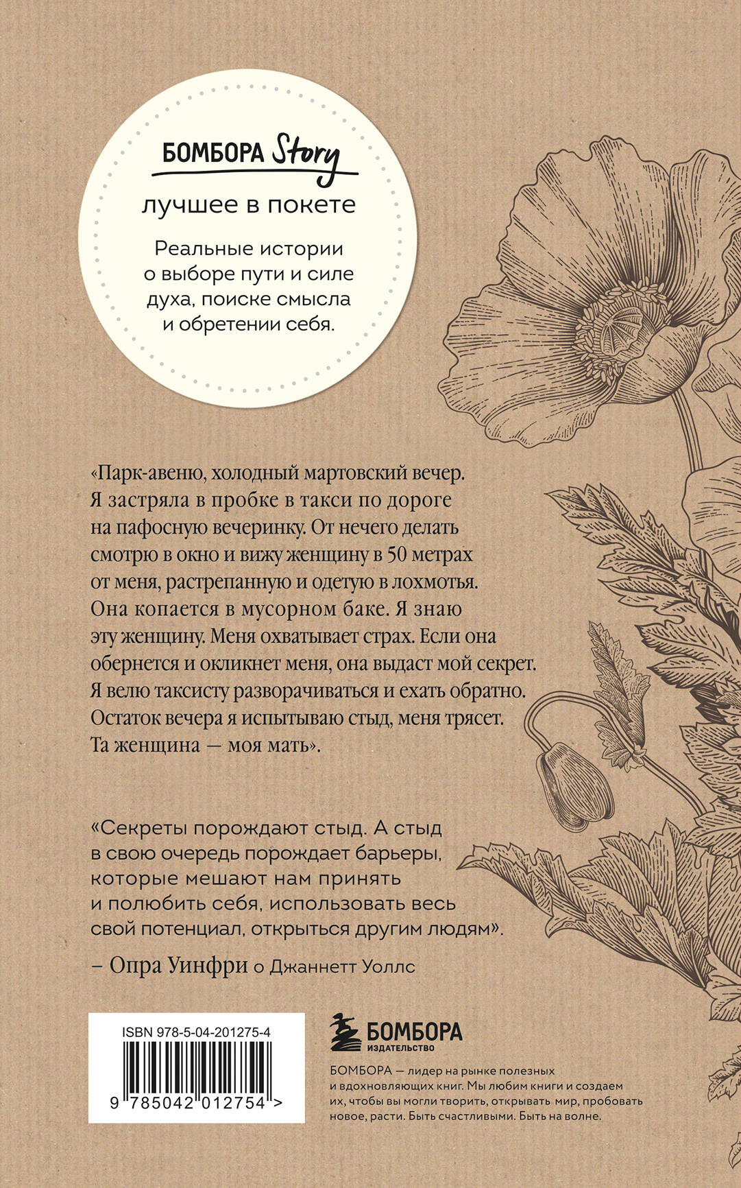 В РОССИИ ПРОДАНО БОЛЕЕ 260 000 экземпляров. «Парк-авеню, холодный мартовский вечер. Я застряла в пробке в такси по дороге на пафосную вечеринку. От нечего делать смотрю в окно и вижу женщину в 50 метрах от меня, растрепанную и одетую в лохмотья. Она копается в мусорном баке. Я знаю эту женщину. Меня охватывает страх. Если она обернется и окликнет меня, она выдаст мой секрет. Я велю таксисту разворачиваться и ехать обратно. Остаток вечера я испытываю стыд, меня трясет. Та женщина - моя мать». ⠀⠀ Всего за несколько недель эта книга превратила молодую журналистку Джаннетт Уоллс в одного из самых популярных авторов Америки. Престижные премии и приглашения на телевидение, первые строчки в книжных рейтингах и продажи миллионов экземпляров, экранизация с Бри Ларсон в главной роли - «Замок из стекла» по праву можно назвать сенсацией в современной литературе. В этой книге Уоллс рассказывает о своем детстве и взрослении в многодетной и необычной семье, в которой практиковались весьма шокирующие методы воспитания. Многие годы Джаннетт скрывала свое прошлое, пока не поняла, что, только освободившись от тайн и чувства стыда, она сможет принять себя и двигаться дальше. ⠀⠀ «Секреты порождают стыд. А стыд, в свою очередь, порождает барьеры, которые мешают нам принять и полюбить себя, использовать весь свой потенциал, открыться другим людям». - Опра Уинфри о Джаннетт Уоллс| Издательство | ООО "Издательство "Эксмо" |