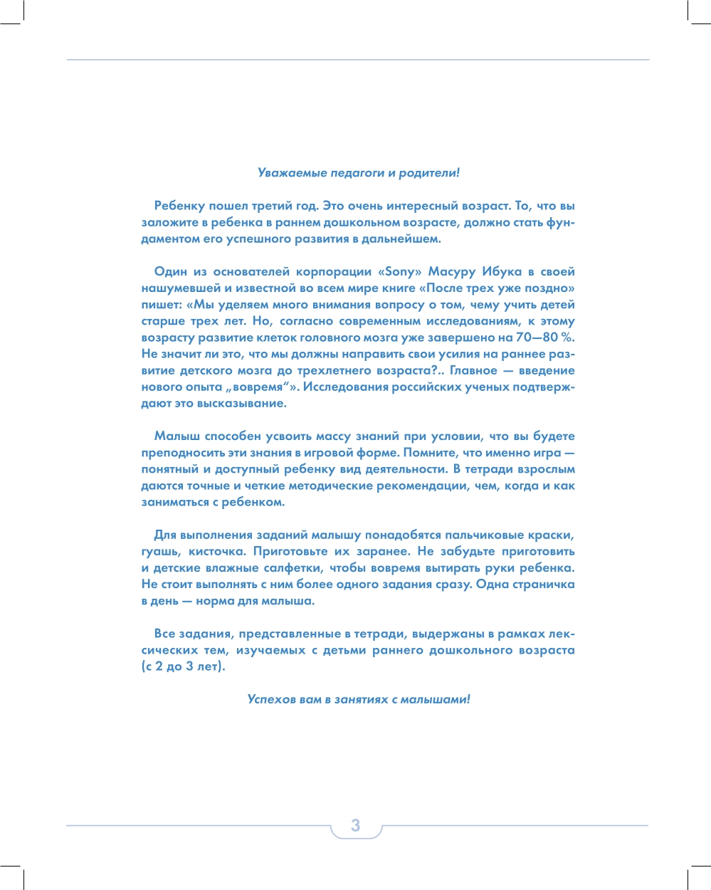 В тетради представлены игровые задания для развития предматематических представлений и сенсорных функций у детей третьего года жизни. Выполняя задания, малыш учится узнавать, называть и различать цвета, определять цвет, размер и форму окружающих предметов, у него формируются понятия один и много. Тетрадь входит в методический комплект «Образовательной программы дошкольного образования для детей раннего дошкольного возраста ( с 2 до 3 лет) с расстройствами речевого и интеллектуального развития «Расти, малыш!» (Н. В. Нищева, Т. Б. Гавришева, Ю. А. Кириллова). Рекомендовано педагогам ДОО и развивающих центров, гувернерам, родителям дошкольников 2-3 лет.