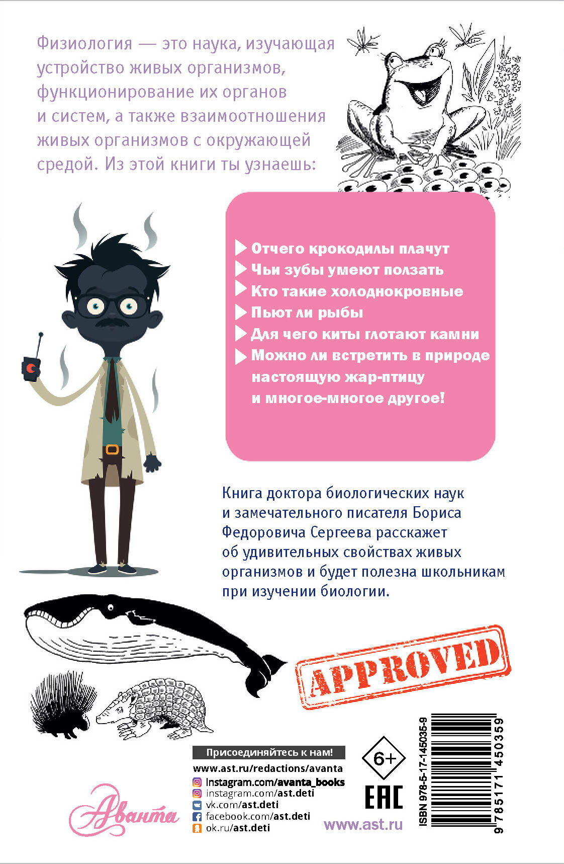 Увлекательно и познавательно! В книге известного ученого, доктора биологических наук Бориса Федоровича Сергеева собраны интересные рассказы и занимательные факты о приспособлениях организма к различным условиям среды, механизмах важнейших жизненных функций, а также об особенностях работы отдельных органов и систем живого организма. Вы узнаете, можно ли встретить в живой природе светящуюся жар-птицу, так ли редки среди ящериц двух- или трехголовые змеи горынычи, какие животные самые морозолюбивые на свете, у кого зубы всю жизнь путешествуют, бывает ли вода мертвой и многое другое. Легкость изложения и оригинальный подход к трудным вопросам делают книгу максимально полезной для школьников, изучающих биологию. Для среднего школьного возраста.| Издательство | Издательство "АСТ" |
