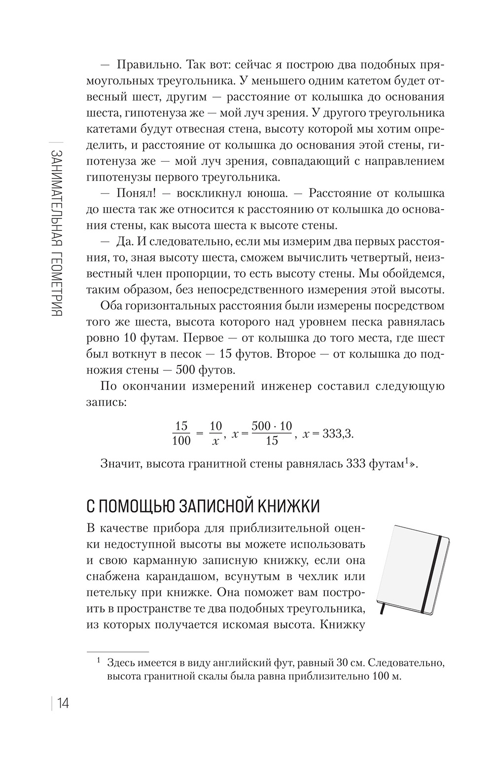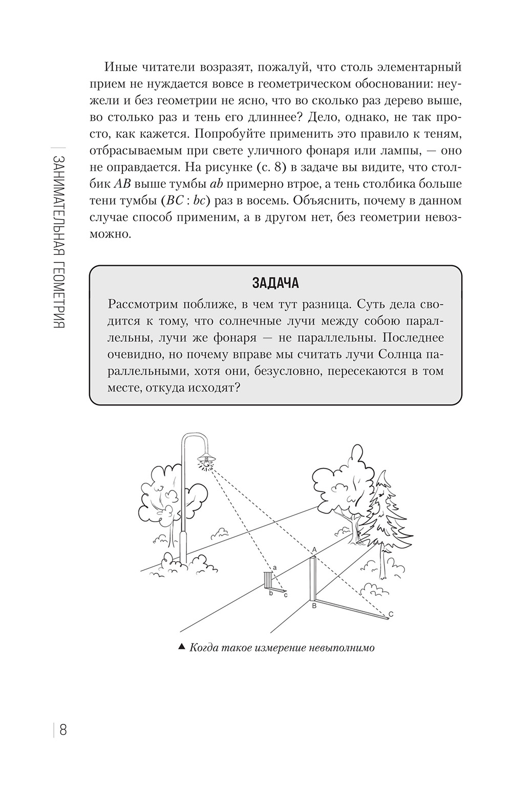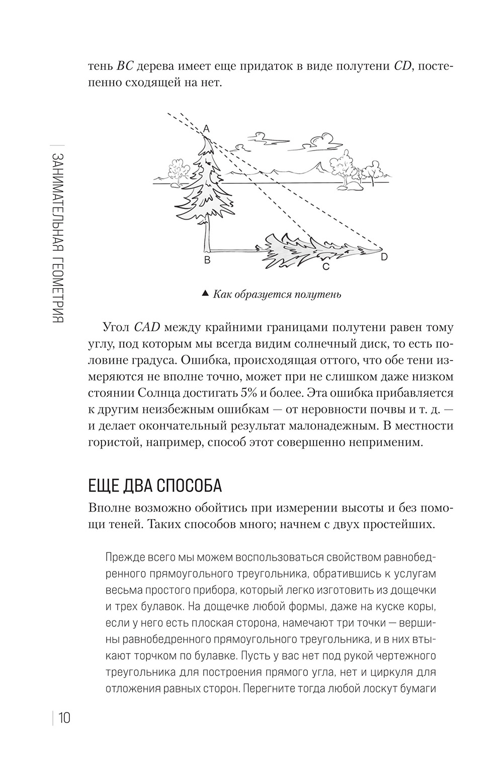 Яков Перельман доказывает, что геометрия - вовсе не «кабинетная» наука, созданная для мучения школьников. В каждом разделе этой книги собраны задачи и истории, которые помогут не только с легкостью запомнить сложные формулы, но и применить их на практике. Перельман разбирает не только известные теоремы, но и практичные житейские вопросы. Как измерить окружность стакана без линейки и сантиметра или сосчитать, сколько звезд отражается на поверхности реки? Почему у деревянных бочек выпуклые бока? Вы начнете получать удовольствие от науки и станете замечать законы геометрии повсюду: на улице, дома - и даже в художественной литературе! В «Занимательной геометрии», к примеру, рассказывается о том, какие геометрические ошибки допустили в своих книгах Свифт и Пушкин. Книга будет интересна не только детям, но и взрослым, а иллюстрации и схемы помогут лучше понять и усвоить материал.
