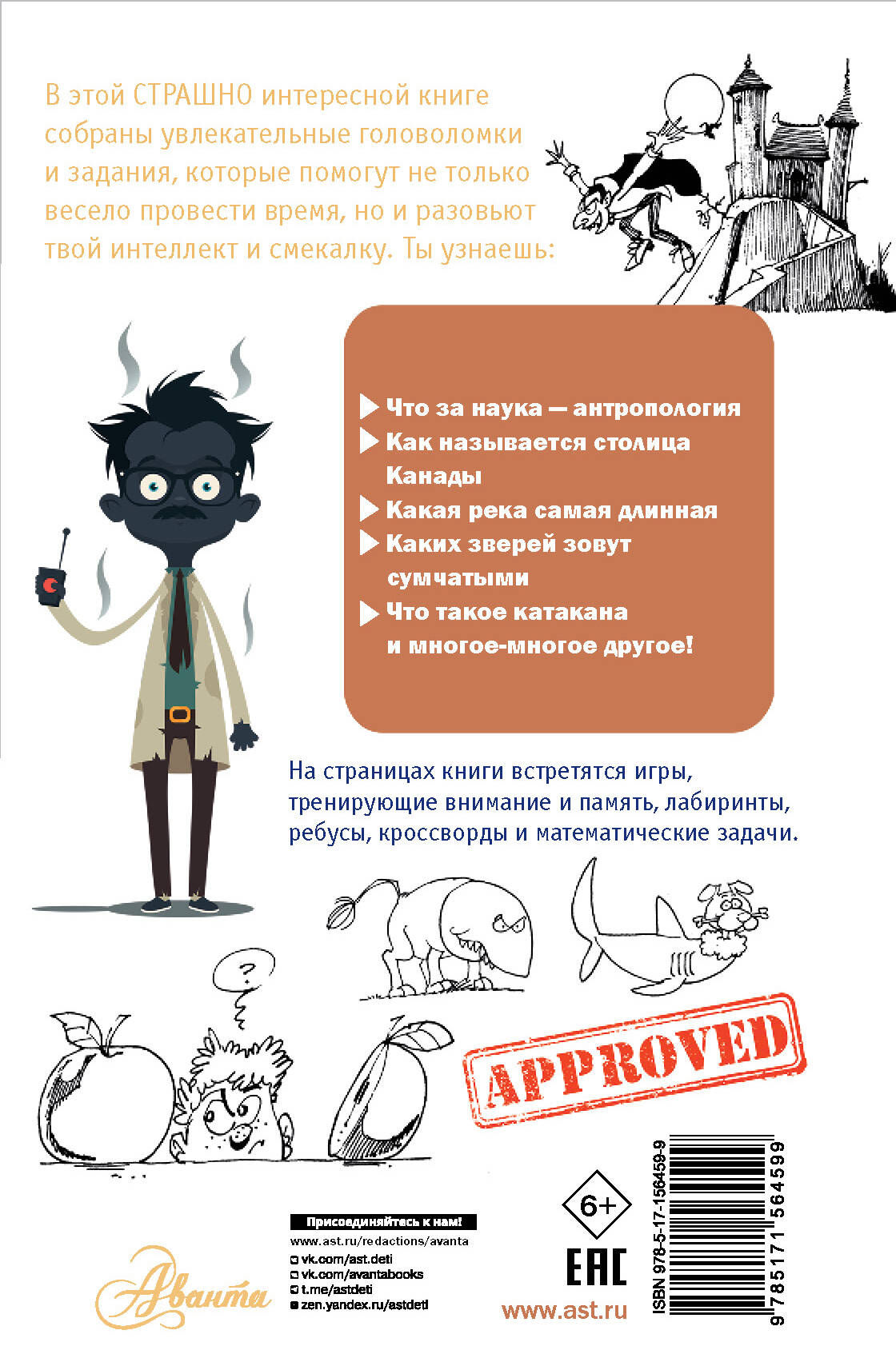 Собранные в этой книге головоломки и игры позволят не только весело провести время, но также развить логику, память, внимательность, сообразительность, навыки устного счета и воображение. Здесь есть задачи на знание географии и истории, математики, русского языка и биологии. А еще разнообразные задания помогут увеличить словарный запас и запомнить новые интересные понятия. Вы узнаете, что такое катакана, пармезан и экстерьер, какое животное оказалось в чайнике в сказке "Алиса в стране чудес", какой породы был Мухтар, как называется столица Бразилии, что изучает сейсмология, а что - антропология и еще многое-многое другое! Для среднего школьного возраста.| Издательство | ИЗДАТЕЛЬСТВО "АСТ" |